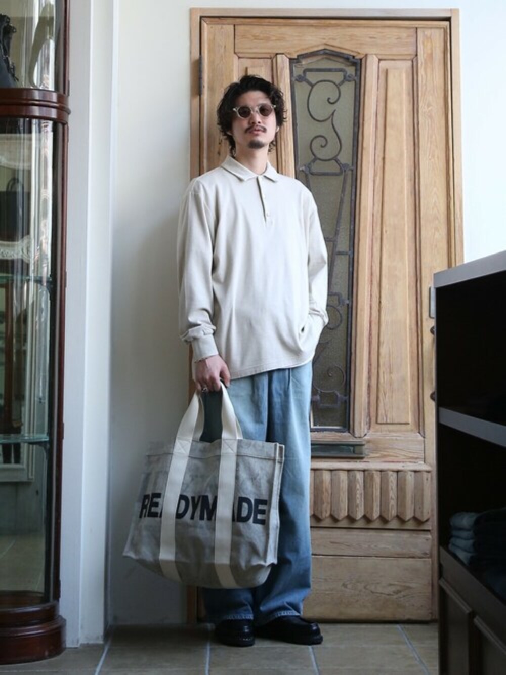 PORT BY ARKのLong sleeve Poloにラフにデニムを合わせて。ポロシャツの、コットンをベースにレーヨンの柔らかさとウールの膨らみを加えた素材がシンプルで落ち着いた印象を与えてくれます。