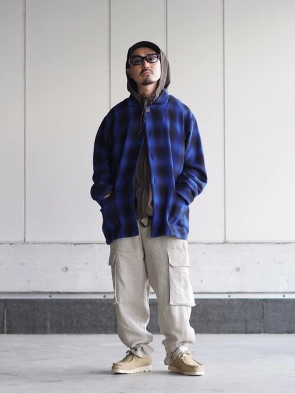 BALLAST ARKのパジャマシャツを着用しました。美しいオンブレチェック柄とリラックス感あるシルエットで、雰囲気の良いアイテムに仕上がっています。