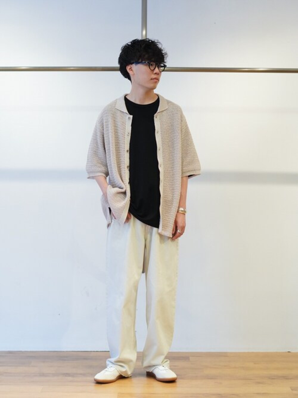 PORT BY ARK(ポートバイアーク)のメッシュシャツとmarka(マーカ)のオフホワイトのデニムでコーデを組みました。 どちらも白系のカラーですが、全く同じ色ではないため表情がつけられます。 インナーにウールTを着用しています。