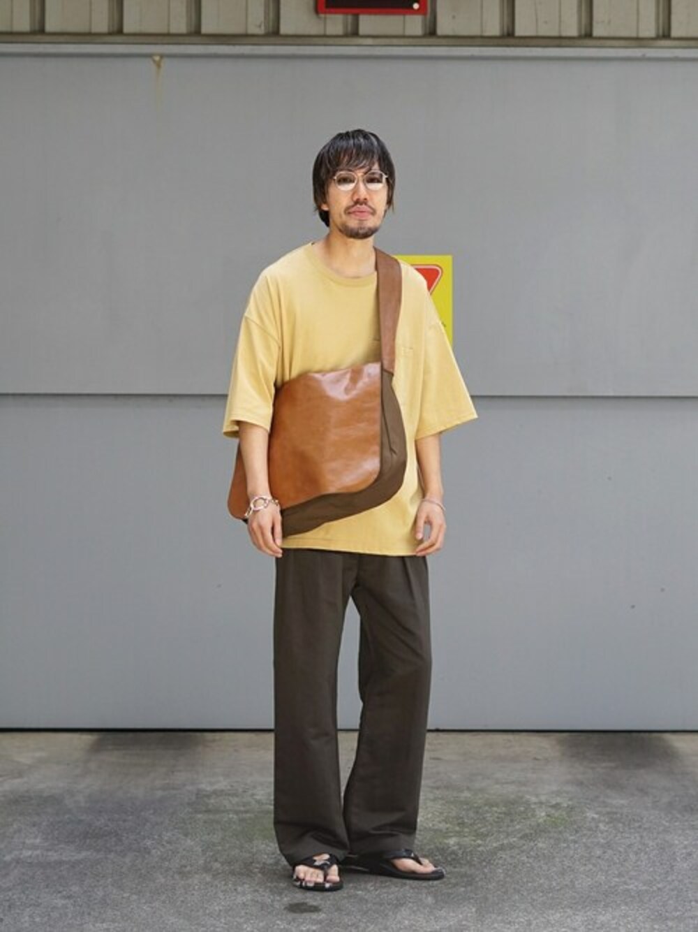BALLAST ARK(バラストアーク)のRUSTIC POCKET TEE、COTTON LINEN 2TUCK EASY PANTSを使ったコーディネート。TOCHIGI LEATHER NEWSPAPER BAGでスタイリングのアクセントに。