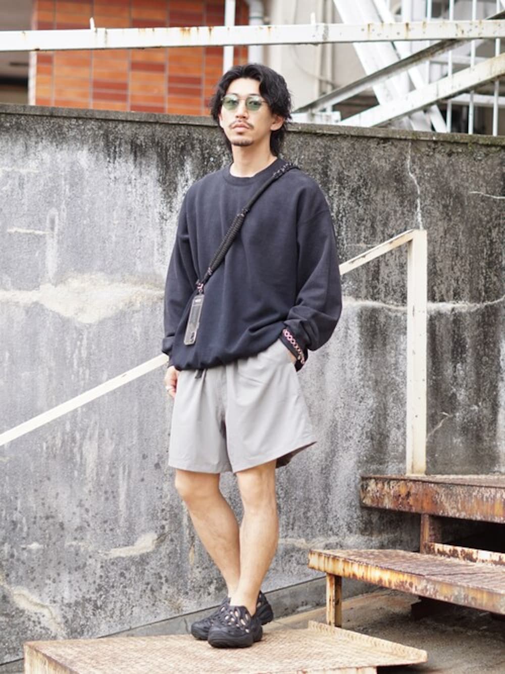 スウェットにショーツを合わせることが出来る限られた時期なので、合わせました! ショーツはFreshServiceでLサイズを着用しております。Mサイズでも着用できますが、丈が少し短くなるので、ほどよくゆとりのあるLサイズを今回は着用しております。