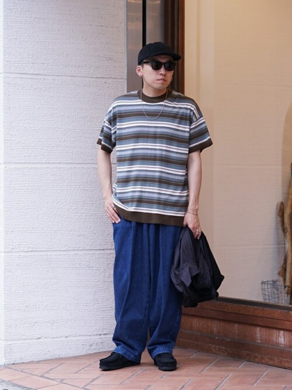 BALLAST ARKの半袖カットソーを着用しました。マルチボーダーのクラシカルな印象もありながら、今っぽいサイジングのアイテムです。