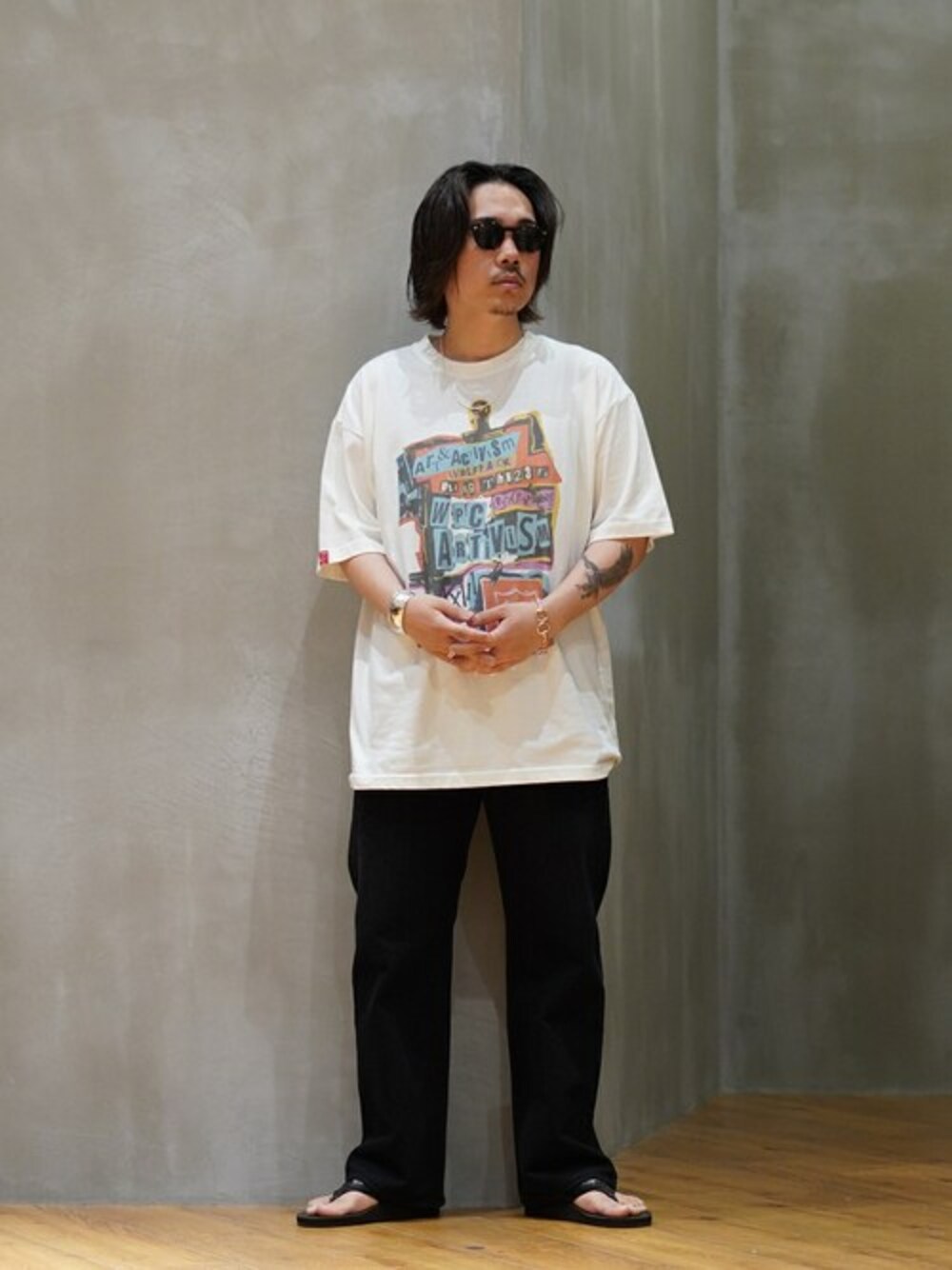 ヴィンテージTのプリントの風合いを特殊な加工で再現したTシャツにmarkaのRELAX STRAIGHT FIT JEANS - black -を合わせました。 裾までストンと落ちる綺麗なストレートシルエットが特徴のデニムは流行り廃りがなく、長く履いていただける一本です。