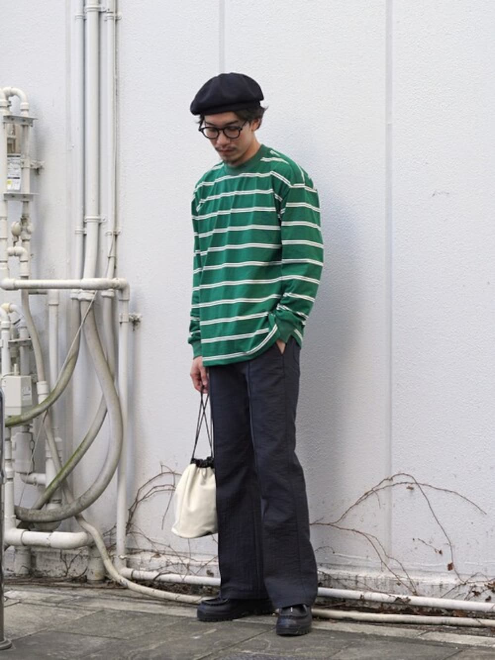 BALLAST ARK のORGANIC COTTON BORDER L/S TEEを使ってコーディネートを組みました。ヴィンテージ感漂う、レトロなダブルボーダーTシャツは、一枚で着用しても存在感があります。シンプルながらもおしゃれな雰囲気を演出します。カジュアルなデニムやチノパンとの相性も抜群で、日常のコーディネートに取り入れやすいアイテムです。