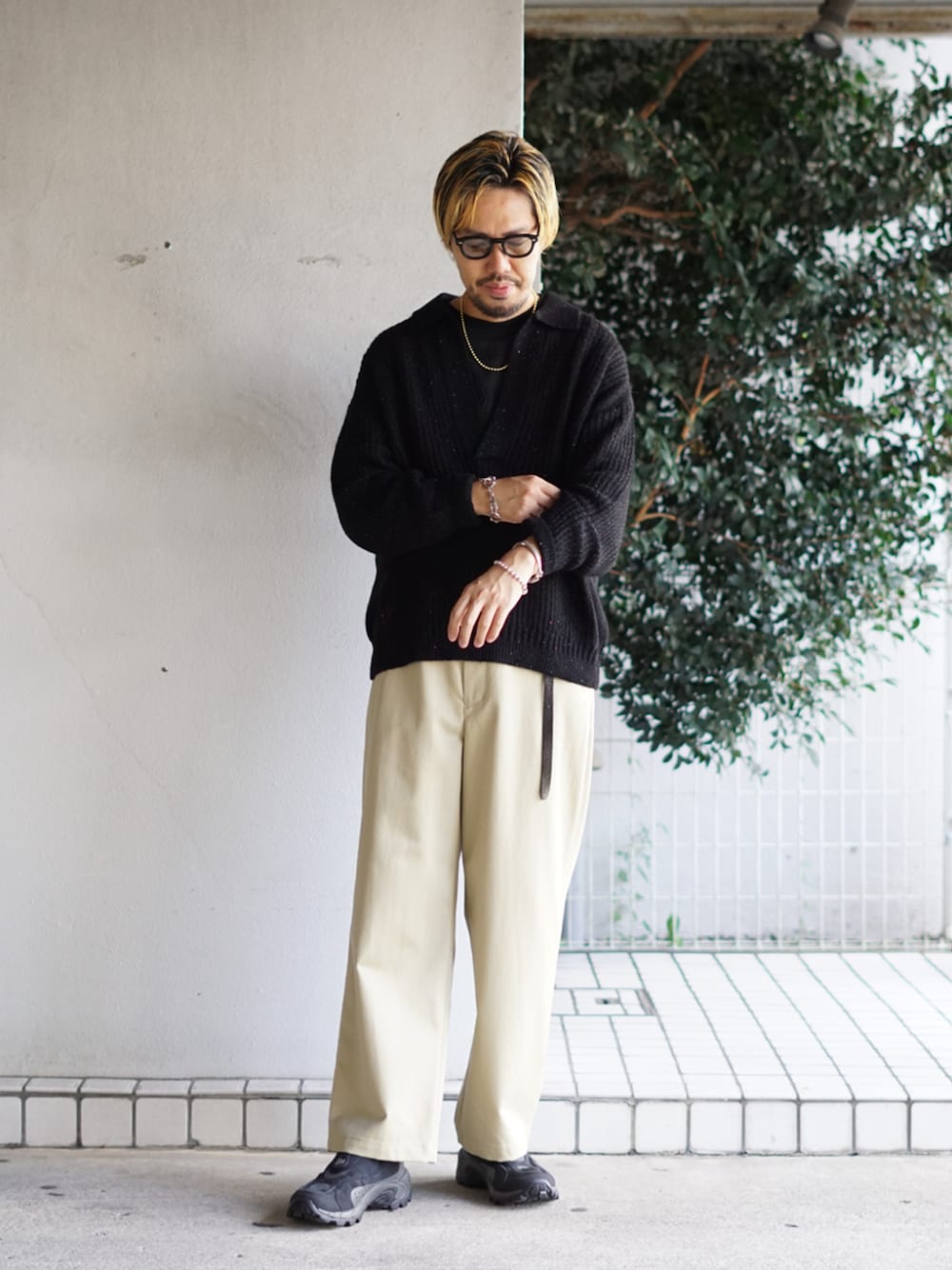 着用モデル:178cm/Lサイズ着用 アイテム:BALLAST ARK 「Sequined Glow Skipper Knit」 ショート丈のデザインのため、178cm・Lサイズでも着丈はちょうど良く、バランスよく着用できます。身幅にはほどよいゆとりがあり、レイヤードもしやすいサイズ感です。肩まわりの可動域も確保されているので、動きやすさも◎。すっきりとした丈感で、ワイドパンツやボリュームのあるボトムとも好相性です。