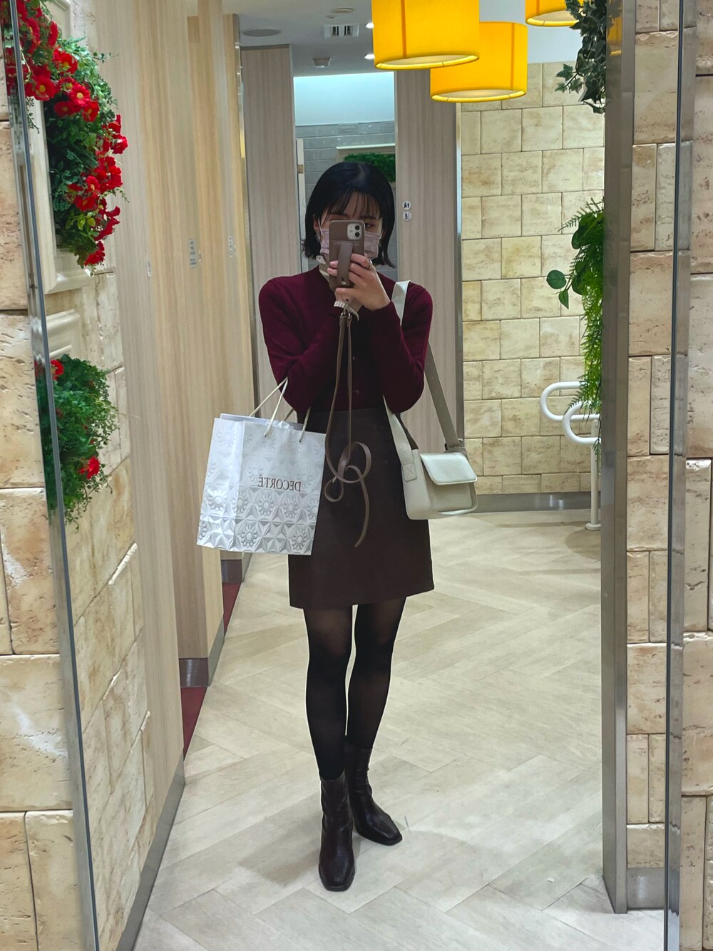 サンタさん🎅とトナカイ🦌を連想させるクリスマスコーデ🎄 白のタートルネックを襟から見せてさらにサンタクロース感を🤍❤️💚
