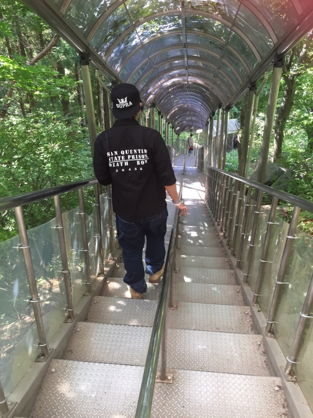 この前デートしてきたあぶくま洞でのコーデ、 このノーブランドのシャツのバックプリントかっこよくて気に入ってます! だけど書いてあるのが死刑囚て、(T . T) 小窓にあぶくま洞の画像アップしたので見てみてくださいめちゃ綺麗だった〜