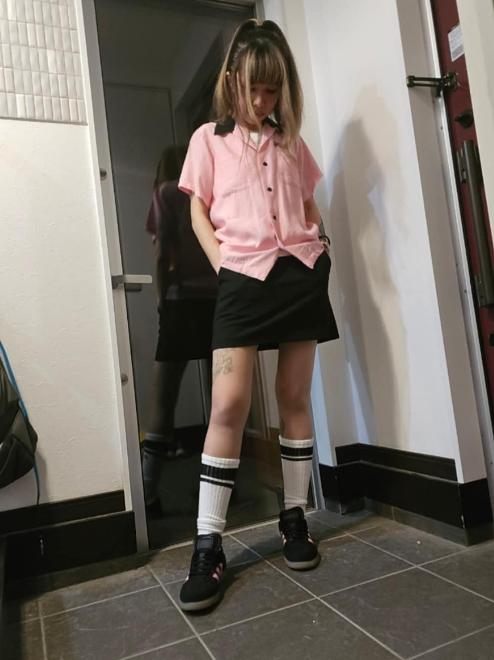 ボーリングシャツとスニーカーの色合わせ スコート合わせて プロボウラー仕様
