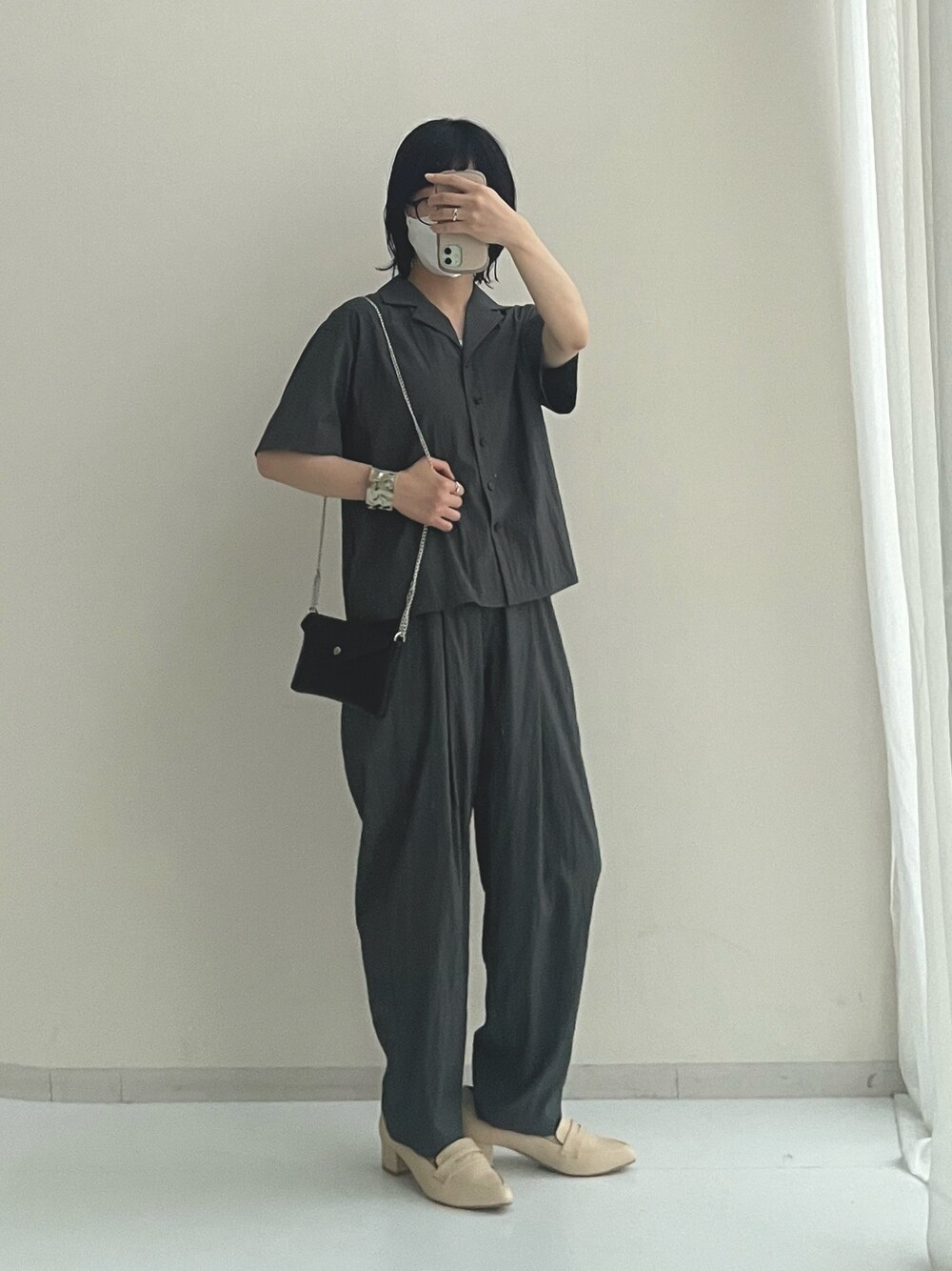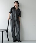 涼しげな素材感のセットアップ。セットアップだけでなく、上下バラバラに着回せるのも◎合わせる小物できれいめにもカジュアルにもなれるデザインです♪