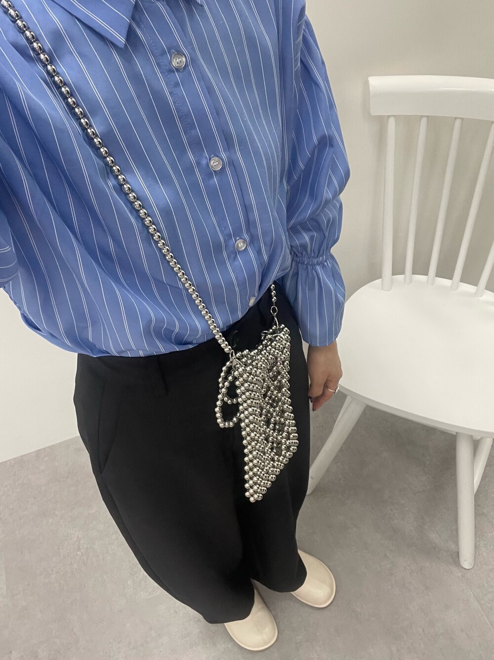 1枚あると着回しできるストライプシャツ。 低身長でもきれいに履けるカーブパンツと合わせると 小物次第でオンオフ問わないコーディネートに。 今回はトレンドのサボサンダル合わせ。 きれい見えするPUアッパーのサボは つっかけ仕様なのでサッと履けて◎