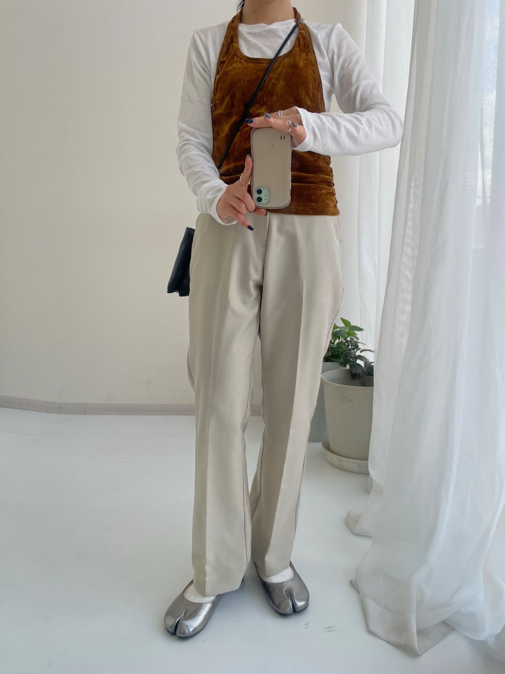履いて感動🥺 丈がぴったりで、足がきれいに見えるフレアパンツ。 シワになりにくそうな素材感も◎ 透けにくかったのでインナーも選びません。 足元はフラットシューズで歩きやすくて 足袋デザインがこなれ感をプラスしてくれます。 着用のクラシック風シルバーは、アッパー素材のシボ感が絶妙です。