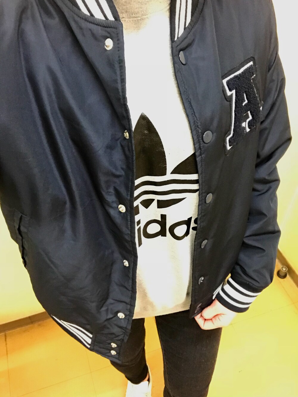 ネイビーのスタジャン☆ 今日は良い天気やったから これだけでも全然寒くなかった🤙 仕事のパンツは黒って決まってるから 出勤コーデはいつも同じような服装。