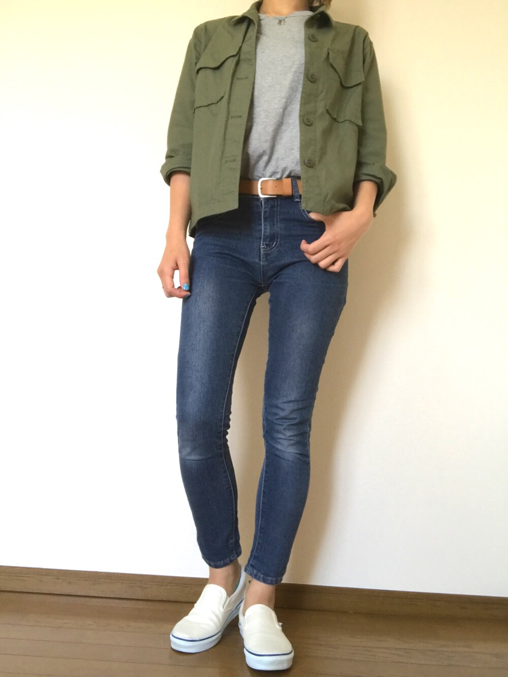 カーキシャツ×グレーT×スキニー☆ シンプルでカジュアルに☆ このカーキシャツめっちゃ使える! お気に入り〜♫