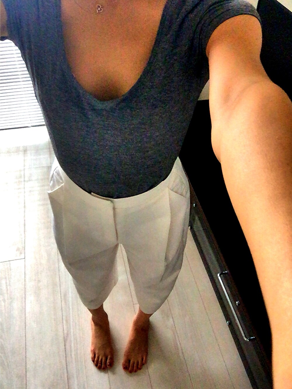 グレー系のTシャツ/カットソー、ホワイト系のその他パンツを着用したレディースの春コーディネートの1枚目の写真