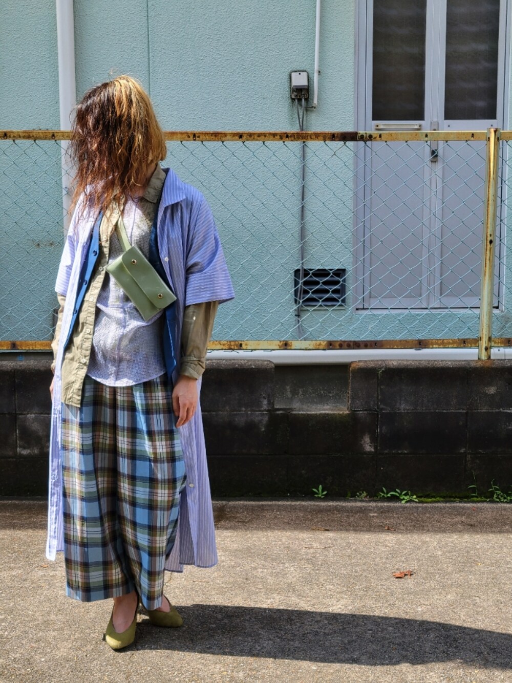 ウエストポーチとホルターネックで 迷ったので両方あげてます 夏物ワンピースを秋コーデに シャツ×シャツ 半袖シャツワンピ×メンズシンプルシャツ ホルターネックとメンズベストで引き締め ストライプ×チェック ハラコのパンプスもグリーンで