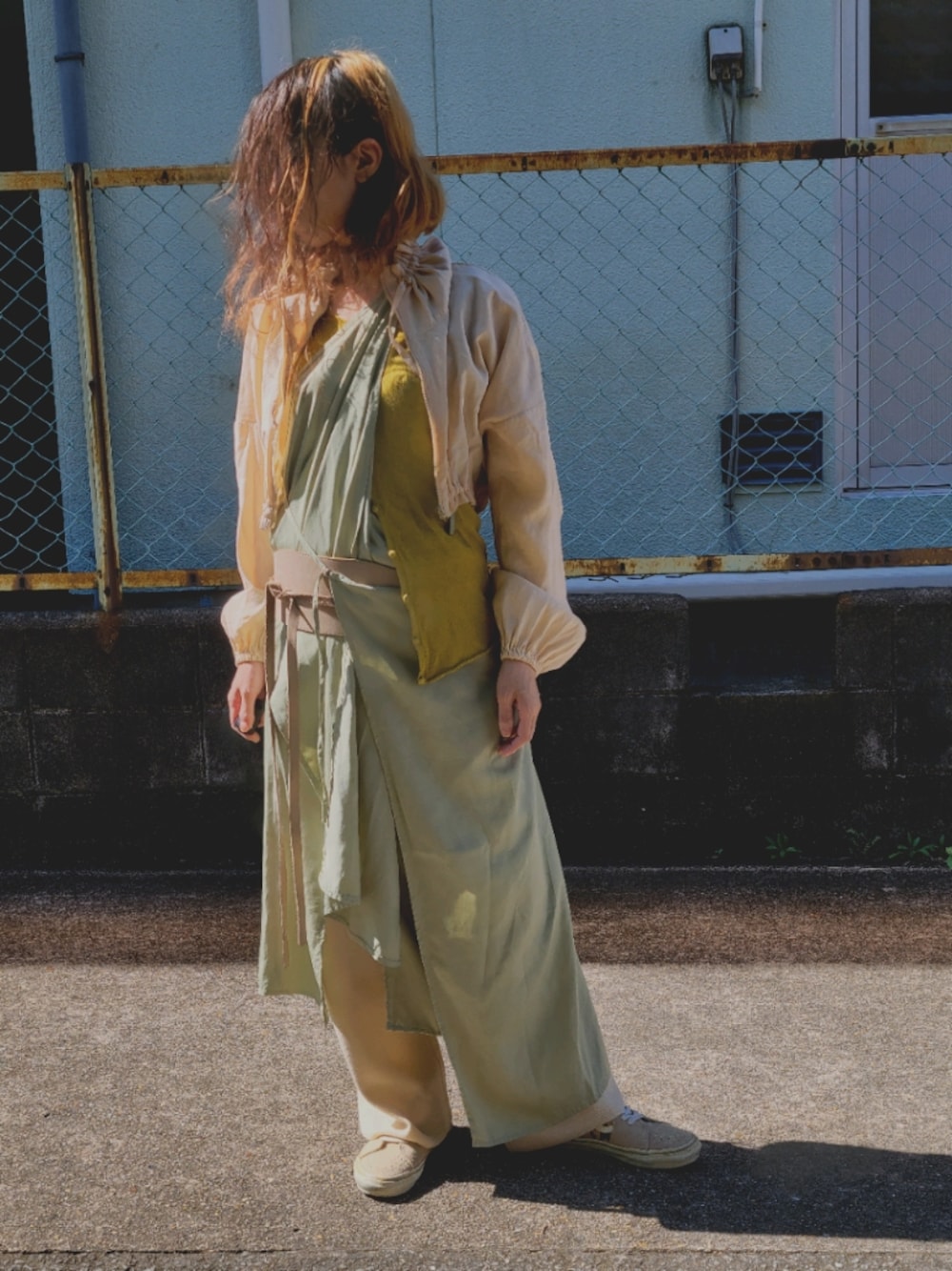 アシンメトリーコーデ カシュクールデザインのワンピースを 変形アレンジ 元の形は登録アイテムをご覧下さい 淡い色味ばかりなので 前あきのニットノースリーブで色差し ボレロ風はおりと、ベルトでスタイルアップ ワンピースのスリットからニットパンツ パンツボリュームに負けないメンズサイズの 迷彩×スエードスニーカー