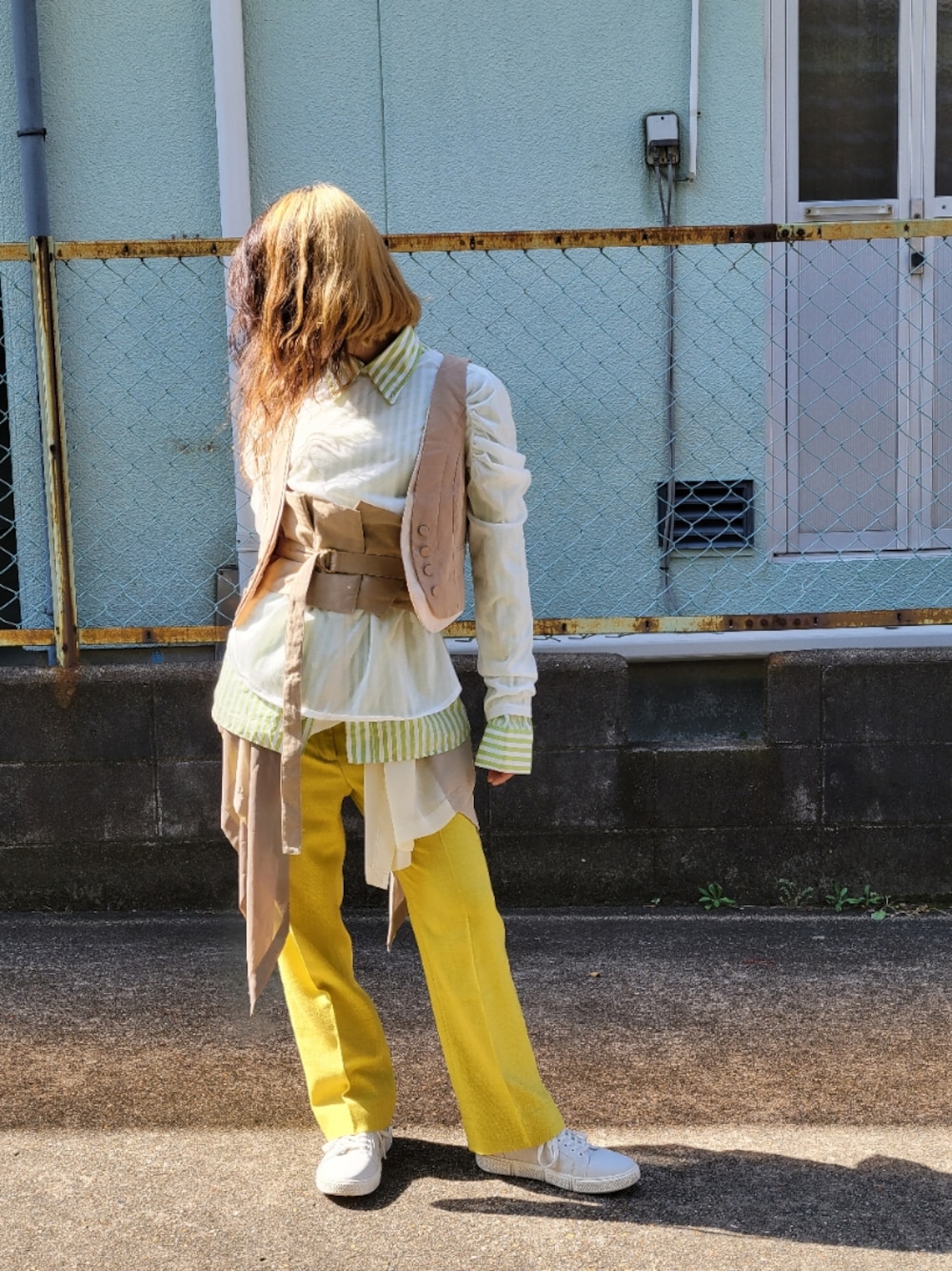 ご覧いただきありがとうございます シアートップスを秋らしく ホワイトシアートップス グリーンストライプシャツを透かして スエード風コルセットベルト ツートーンジレ シャツのしたにバイカラージレ キレイ色センタープレスパンツ レザースニーカーでカジュアルダウン