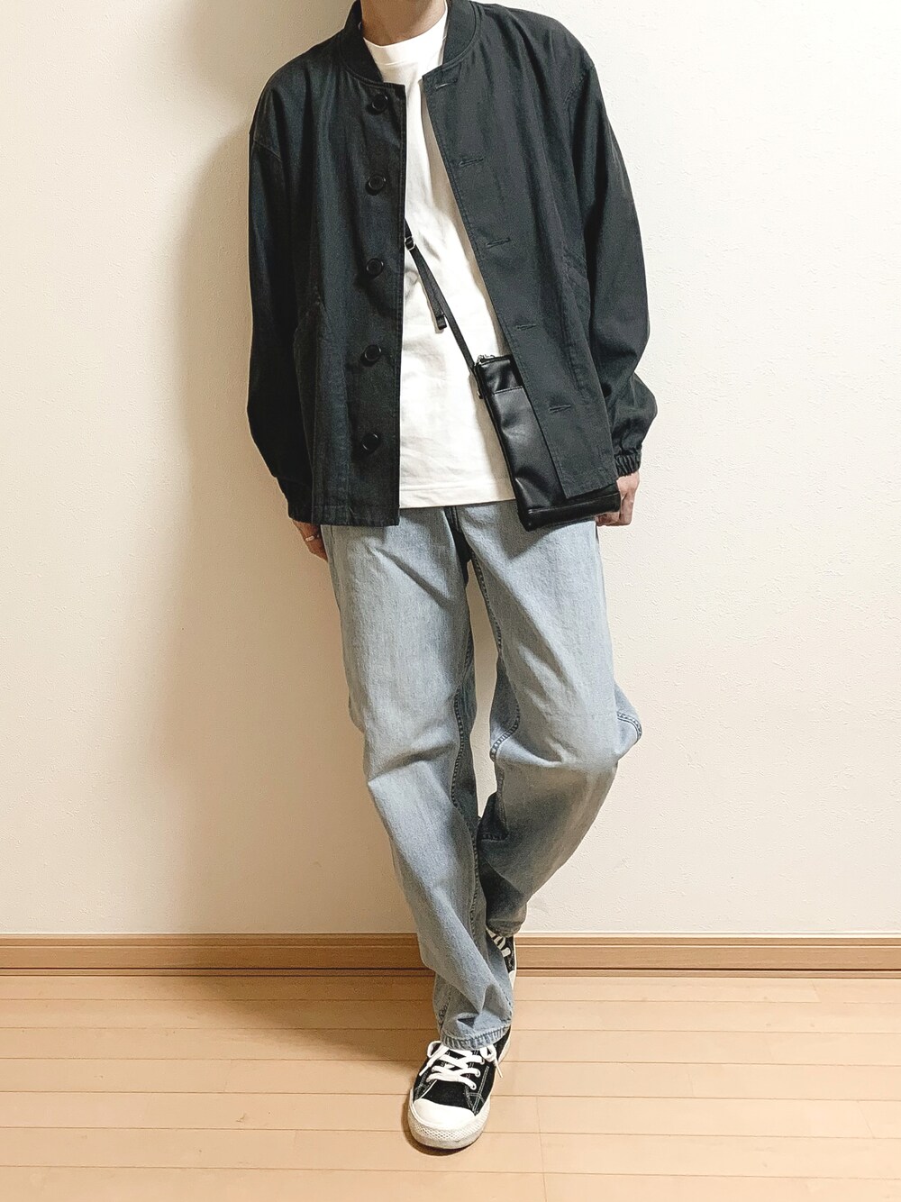 ブラック系のブルゾン、ブルー系のデニムパンツを着用したメンズの冬コーディネートの1枚目の写真