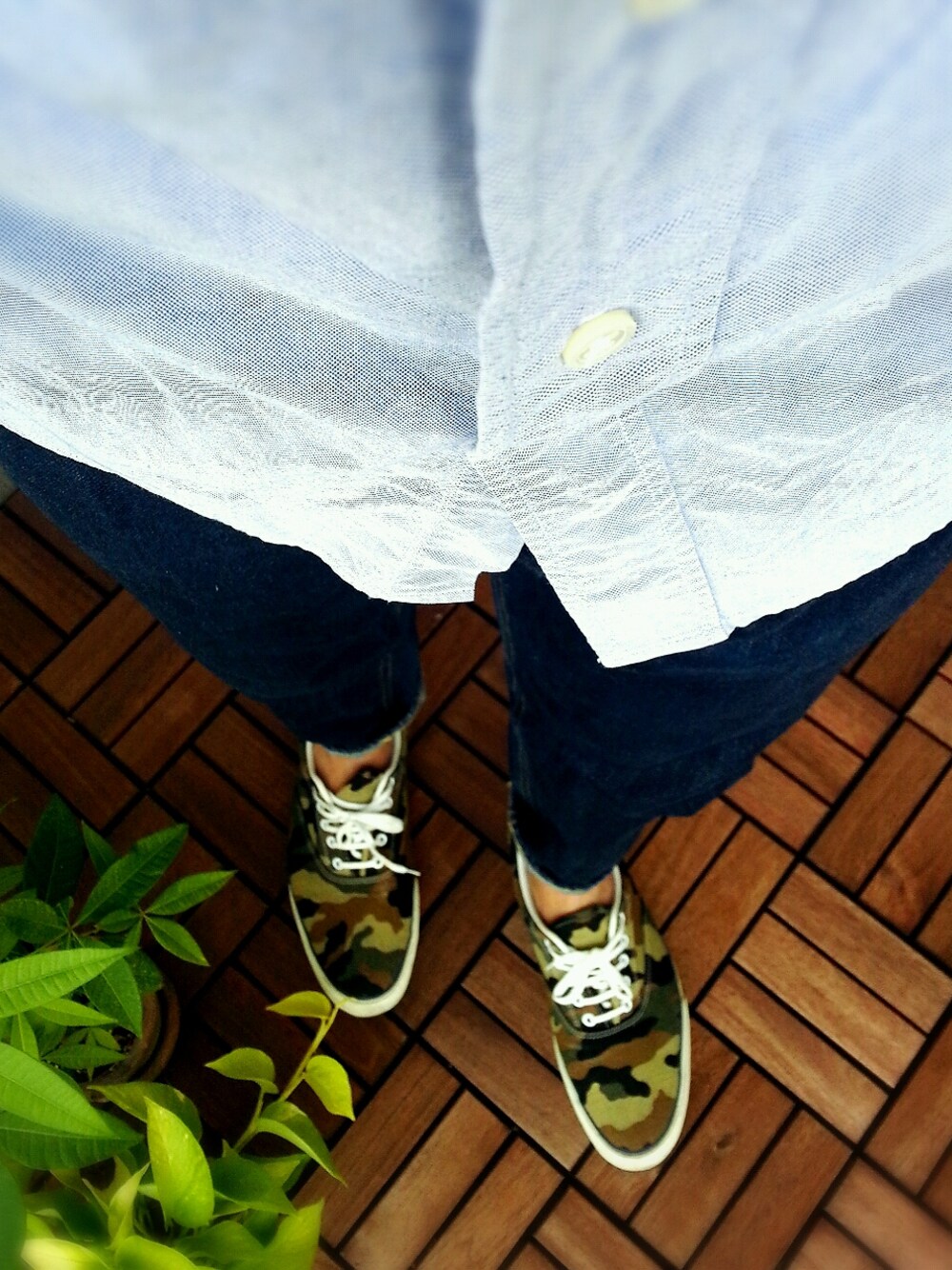 その他のシューズ、ブルー系のトップスを着用したメンズの秋コーディネートの1枚目の写真