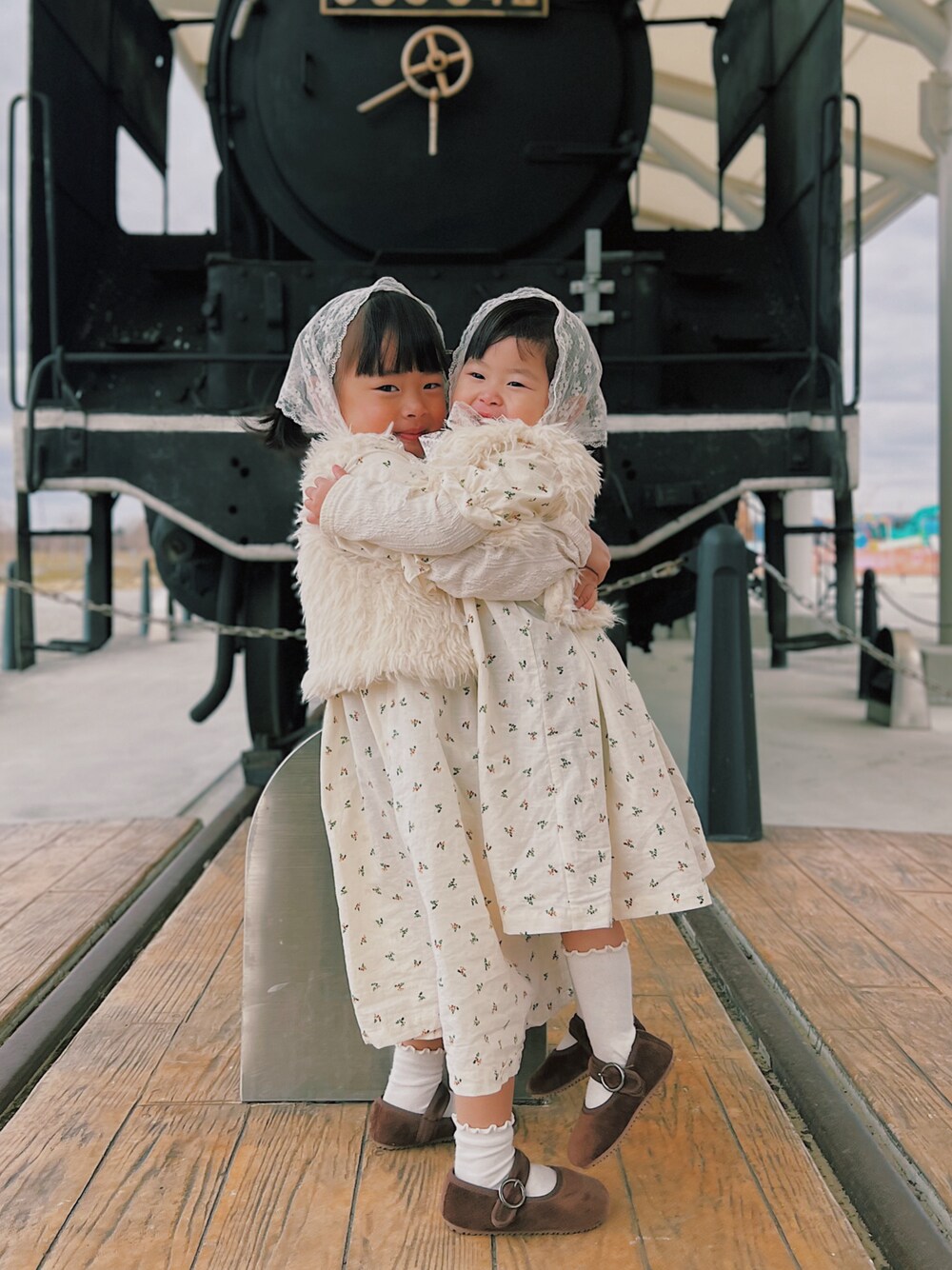ホワイト系のワンピース、ホワイト系のベストを着用したキッズの春コーディネートの1枚目の写真