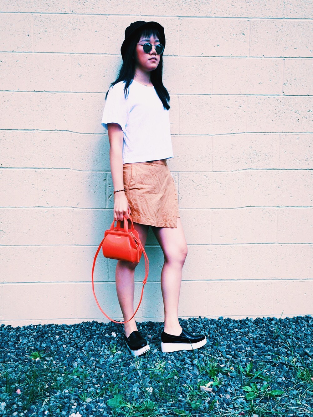It is a summer look with beige color and bright orange mini handbag. Also silver sunglasses are still a huge trend this summer✌️✌✌