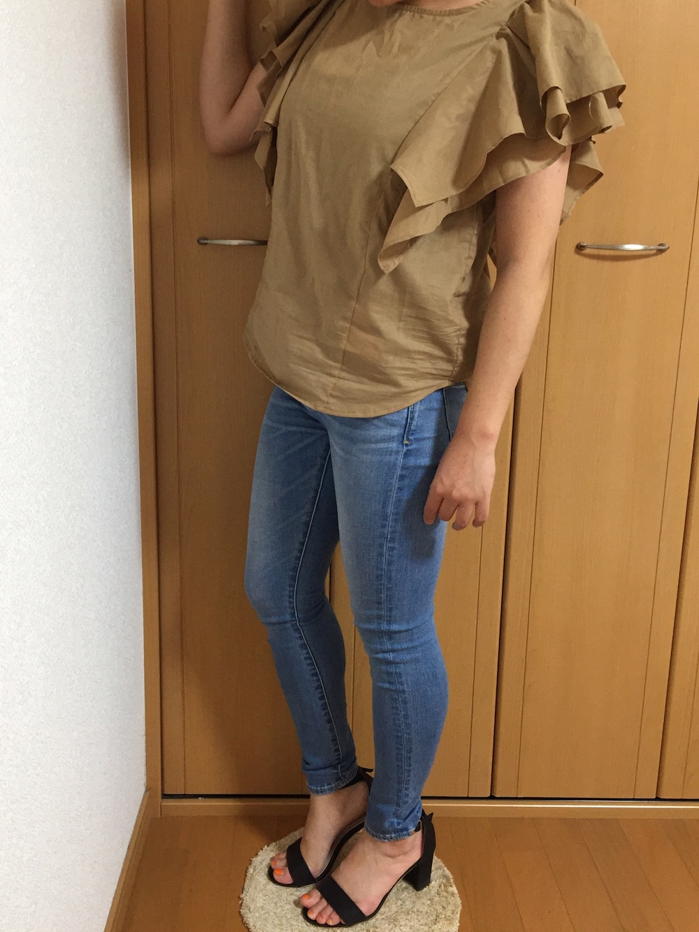 m--a--のシャツ/ブラウス「【新色登場】【再入荷】ボリューム立体肩フリルコットン100%後ろ1ボタン裾ラウンドカットノースリーブブラウス」を使ったコーディネート