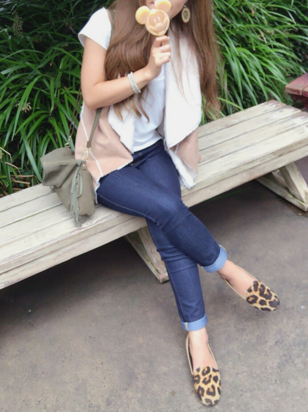 TDSいってきたー❤ どうしても秋服着たくてボアのベスト着たけど やっぱり暑すぎた😂(笑) THE プチプラコーデです! ワンポイントにヒョウ柄💓こういうのすき💓 歩き疲れたけどやっぱり夢の国は楽しいね~☺︎♡