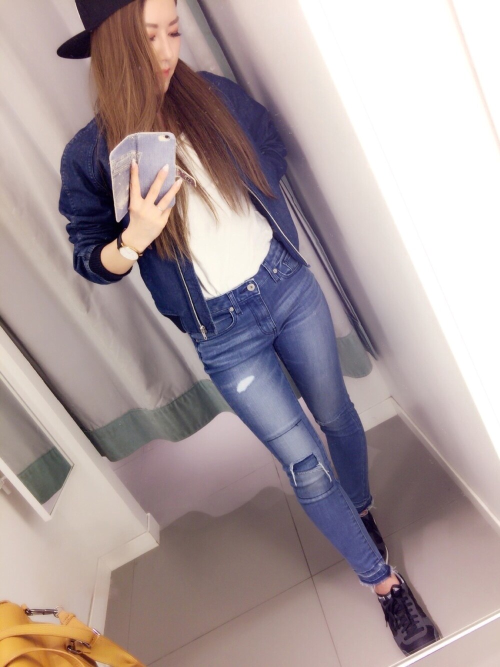 denim on denim コーデ✨👕👖 デニムのブルゾンは珍しくてお気に入り~❤ キャップも被って今日はボーイッシュ風に🤙