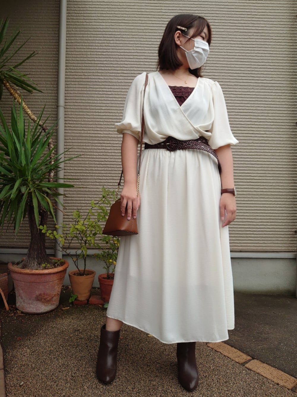 Riのワンピース「2WAYカシュクールワンピース(5分袖) アイボリー」を使ったコーディネート