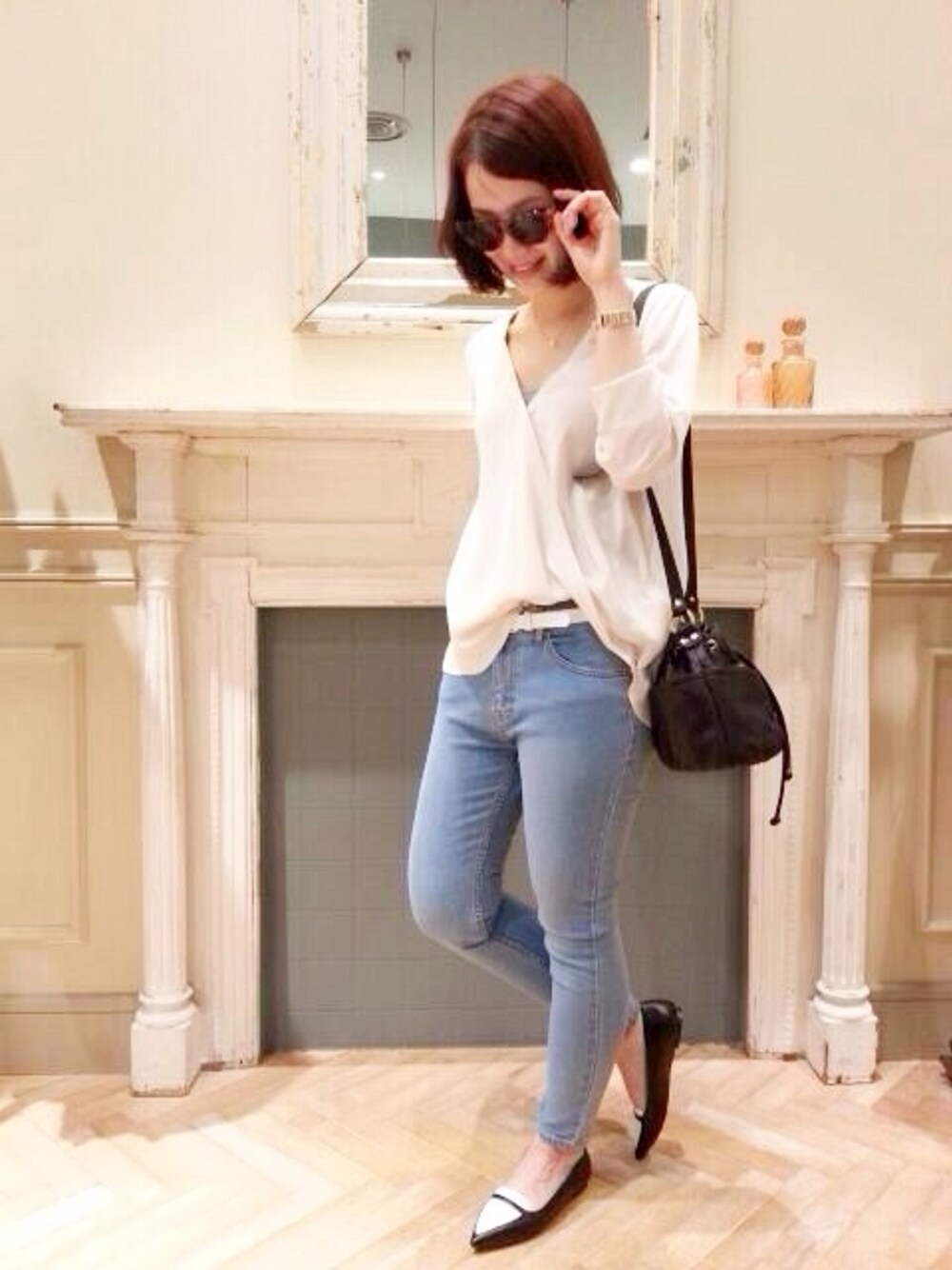 繊細なシルクのブラウスにデニムを合わせた、大人カジュアルコーデです(^^) 春らしい淡いカラーのコーデを、クールな印象のブラック小物で引き締めました★