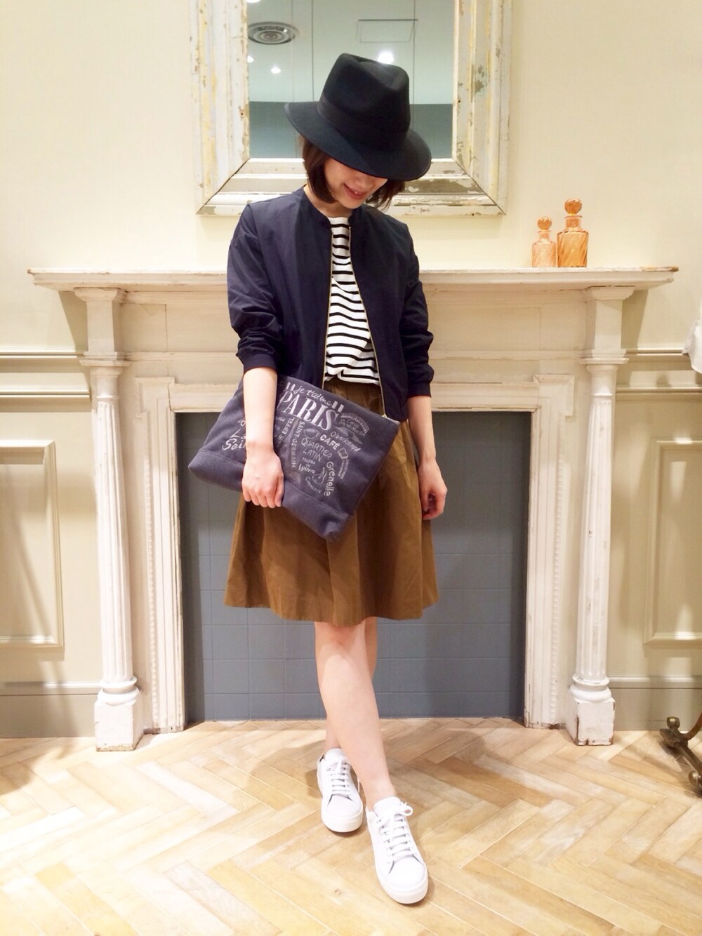 コンパクトなサイズ感のブルゾンに、今年らしいキャメルのスカートを合わせました(^^) 白スニーカーでスポーティーに☆