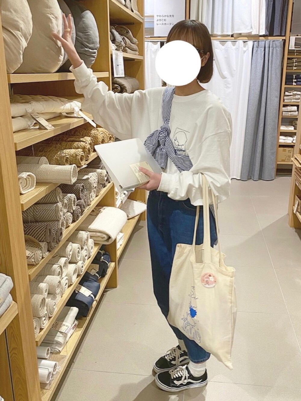 最近ブルーがマイブーム🥣 ˎˊ˗ UNIQLOのストライプシャツ 羽織ったりたすき掛けしたりインナーで着たりと アレンジがたくさんできて 買ってよかったな〜と思っています ☺︎✨ お気に入りのトートバッグは V6のコンサートグッズですっ! 色合いとロゴが可愛いんです🧵𓂃 𓈒𓏸