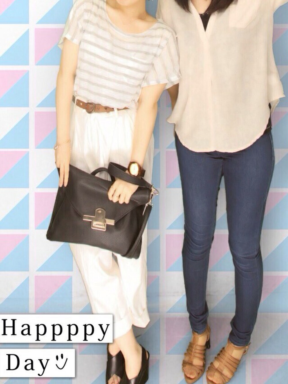 左側です ホワイトとグレーのボーダーで ゆるーくマリンにしました 黒のクラッチバッグと サンダルで引き締めました