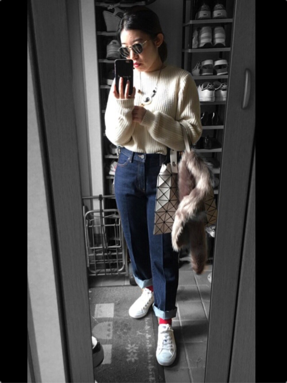 いいね、セーブいつもありがとうございます! 短足な太足をすらりと見せてくれるデニム買いました👖✨ 裾が前後でカットの長さが違っていて可愛いのですが 今日はロールアップで差し色に赤を入れました🍎🍎 安定の妹のアウター拝借です、笑