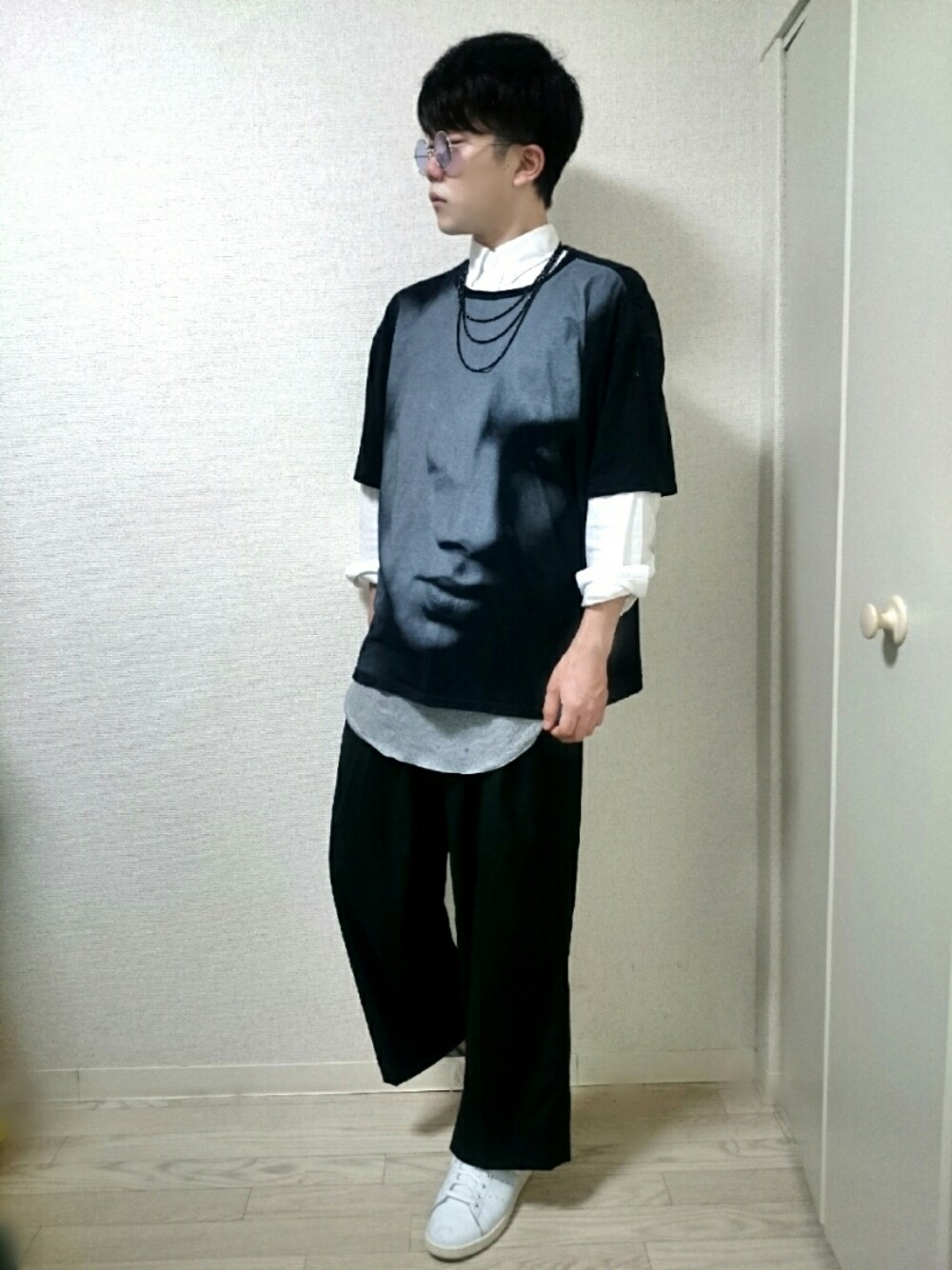ゆるいモノトーンレイヤードコーデ∠( 'ω' )/ イケメンがプリントされてる シュールなTシャツが好き。