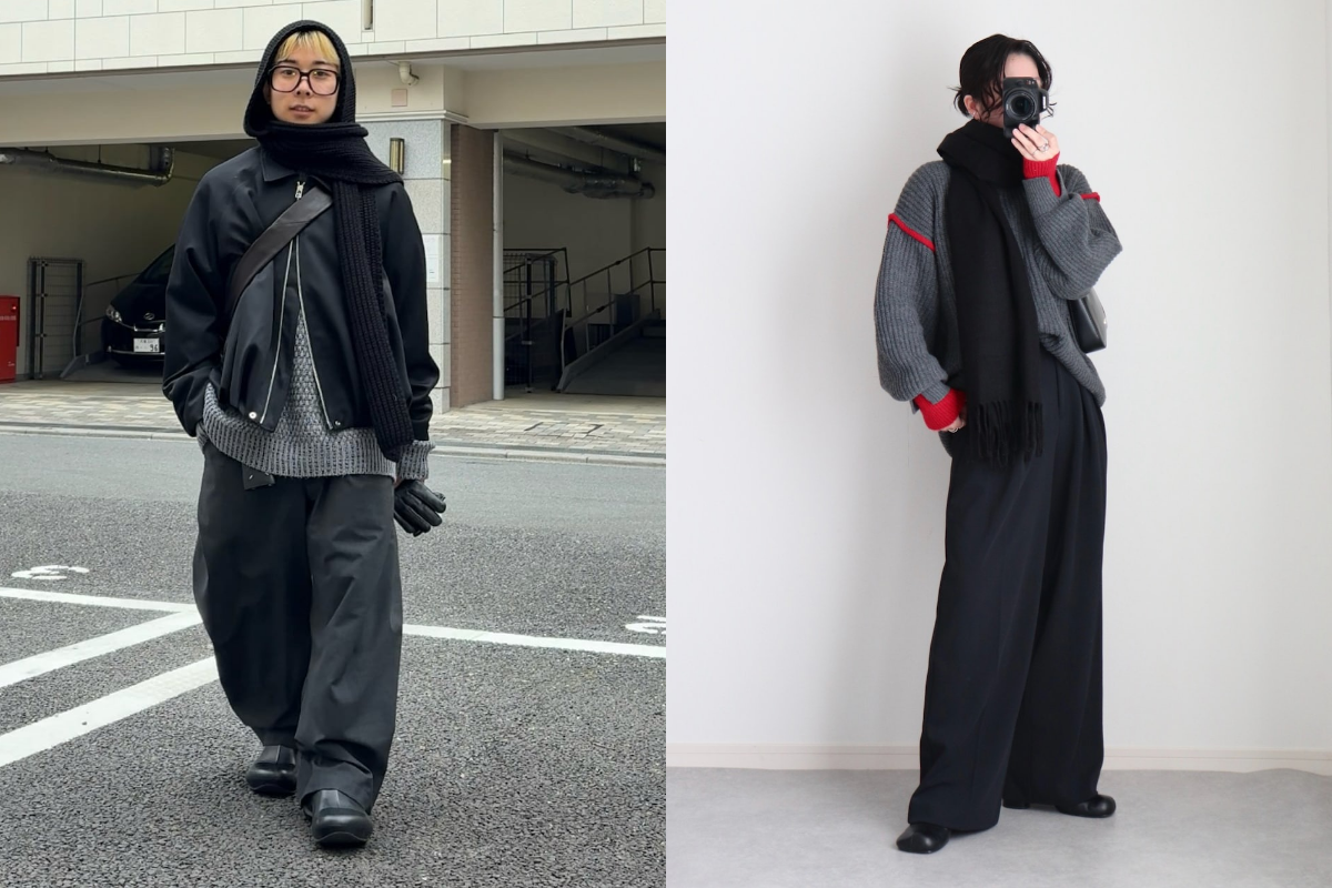 黒のコートやダウンなどのアウターにこれらの色を合わせると、都会的で洗練された印象になります。ボトムスには「スラックス」を合わせ、その中でも「ワイドストレート」などのシルエットを選ぶと、今っぽいリラックス感と上品さを両立できます。 全身の色数が少ない分、素材感やシルエットのきれいさが際立つ、初心者の方にも挑戦しやすいスタイルです。