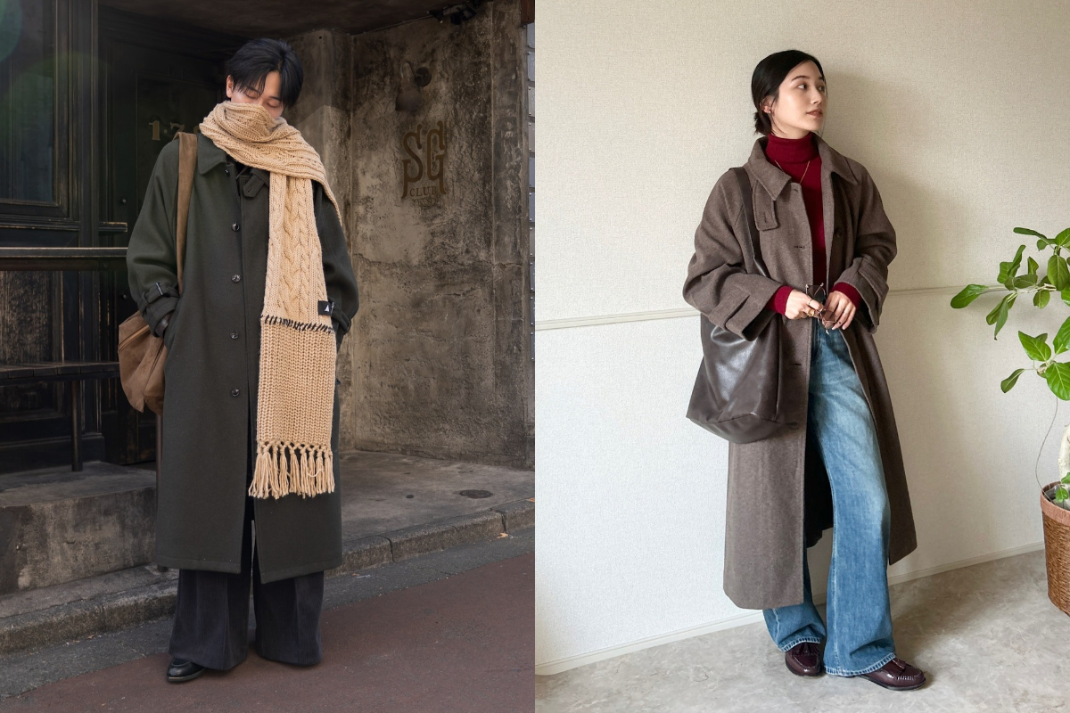 羽織るだけで全体の印象を上品にまとめてくれる「ウールロングコート」は、男女問わず初詣に最適なアウターです。神聖な場所にも馴染む落ち着いた雰囲気があり、簡単に「きれいめカジュアル」な印象を与えてくれます。
