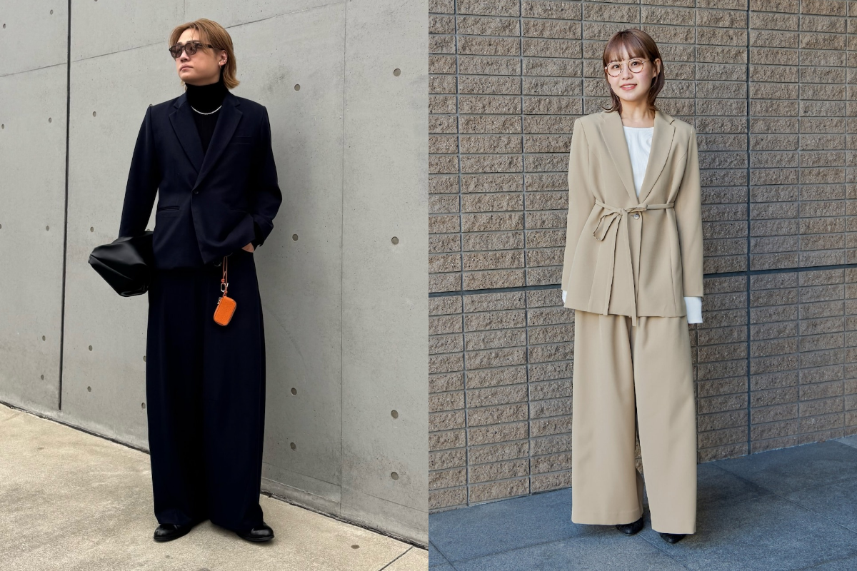 ベージュのセットアップを使った明るい印象のコーデです。ジャケットのリボンデザインと、パンツのワイドシルエットで、こなれた雰囲気に。インナーをあえてジャケットの袖から見せることで、適度なカジュアルさを醸しています。