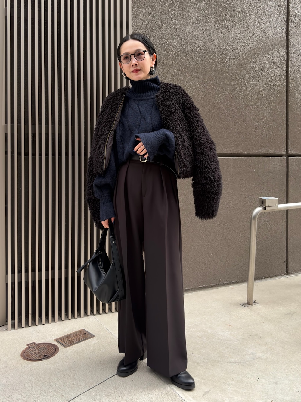 ネイビーのハイネックケーブルニットに、黒スラックスを合わせたコーデです。同じく黒のショート丈ボアジャケットを羽織ってアクセントにしています。