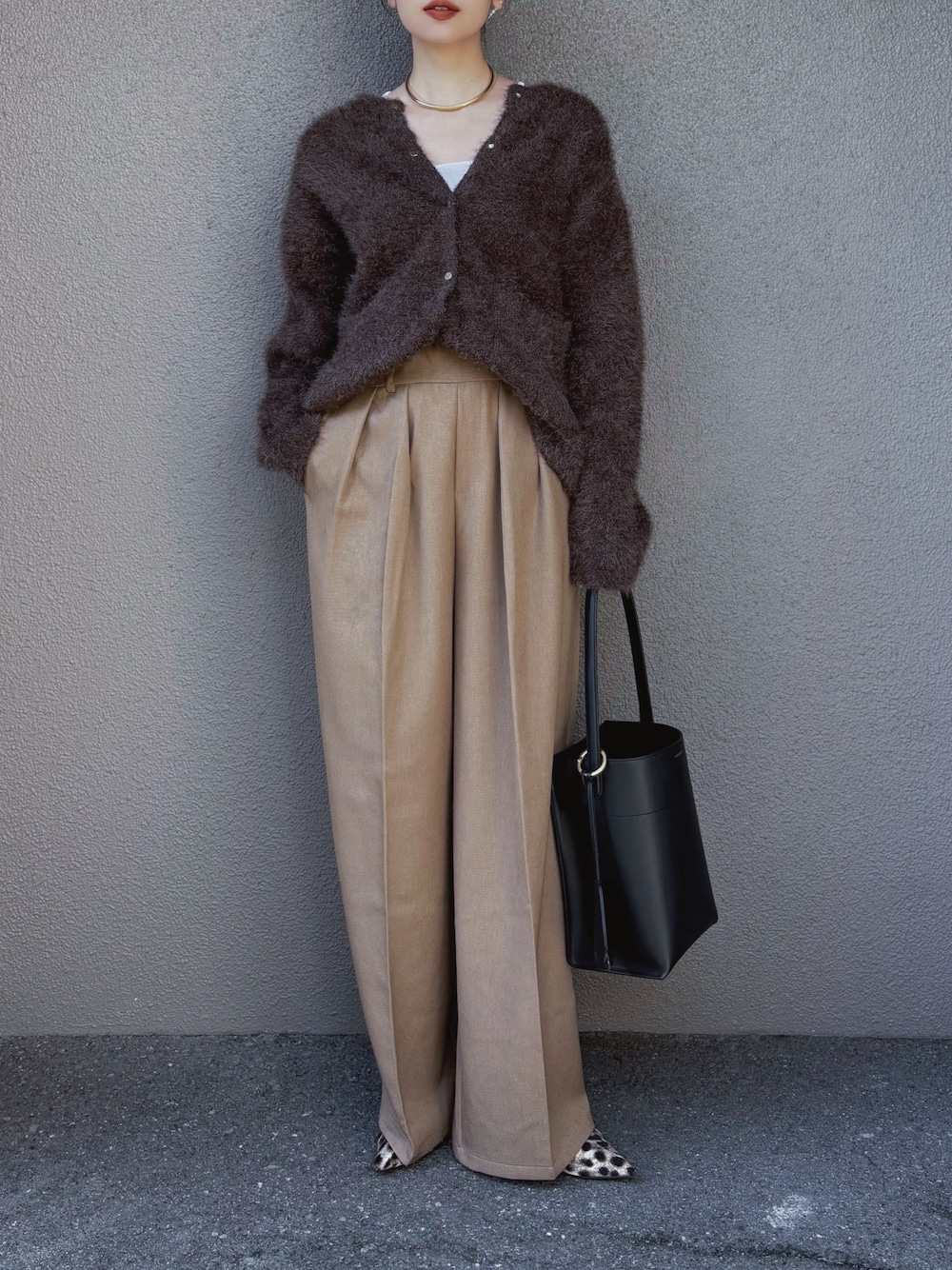 ブラウンのシャギーカーディガンにベージュのスラックスを合わせた、統一感のあるコーデです。カーディガンをショート丈にしつつセンタープレスの入ったスラックスを選ぶことで、上半身に視線を集めてよりスタイルアップして見せています。