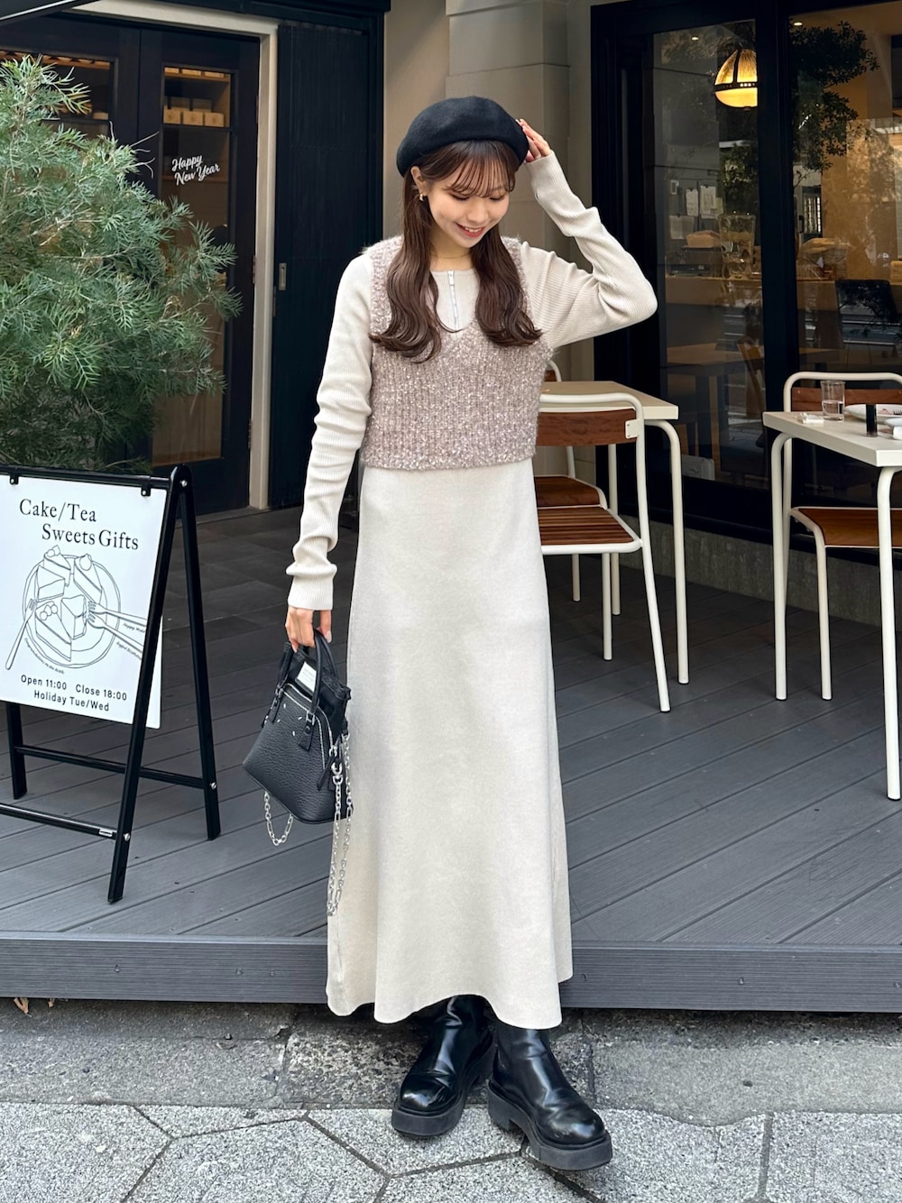 ニットベストとワンピースのレイヤードコーデです。ベージュ系で揃えられたベストとワンピースで統一感のあるスタイルに。小物は黒で揃えて、メリハリのある印象に仕上げています。