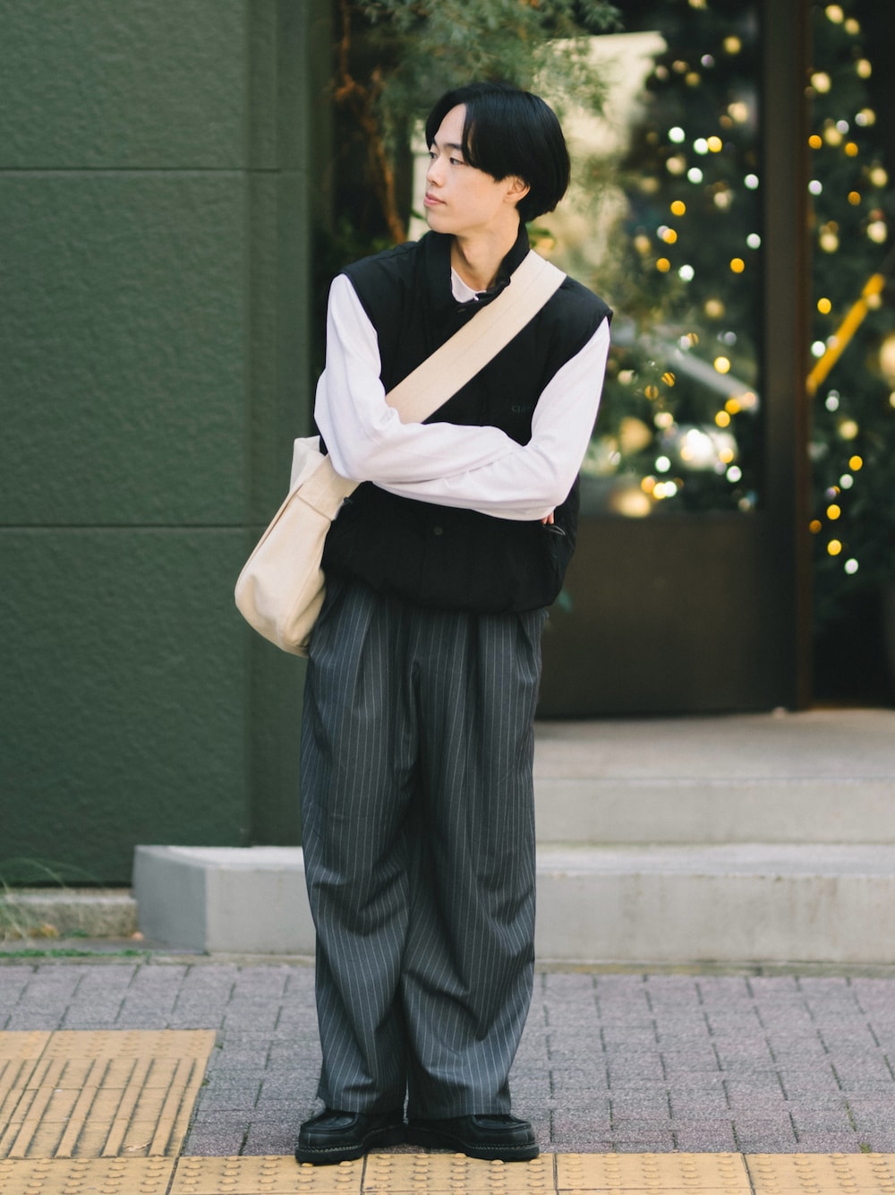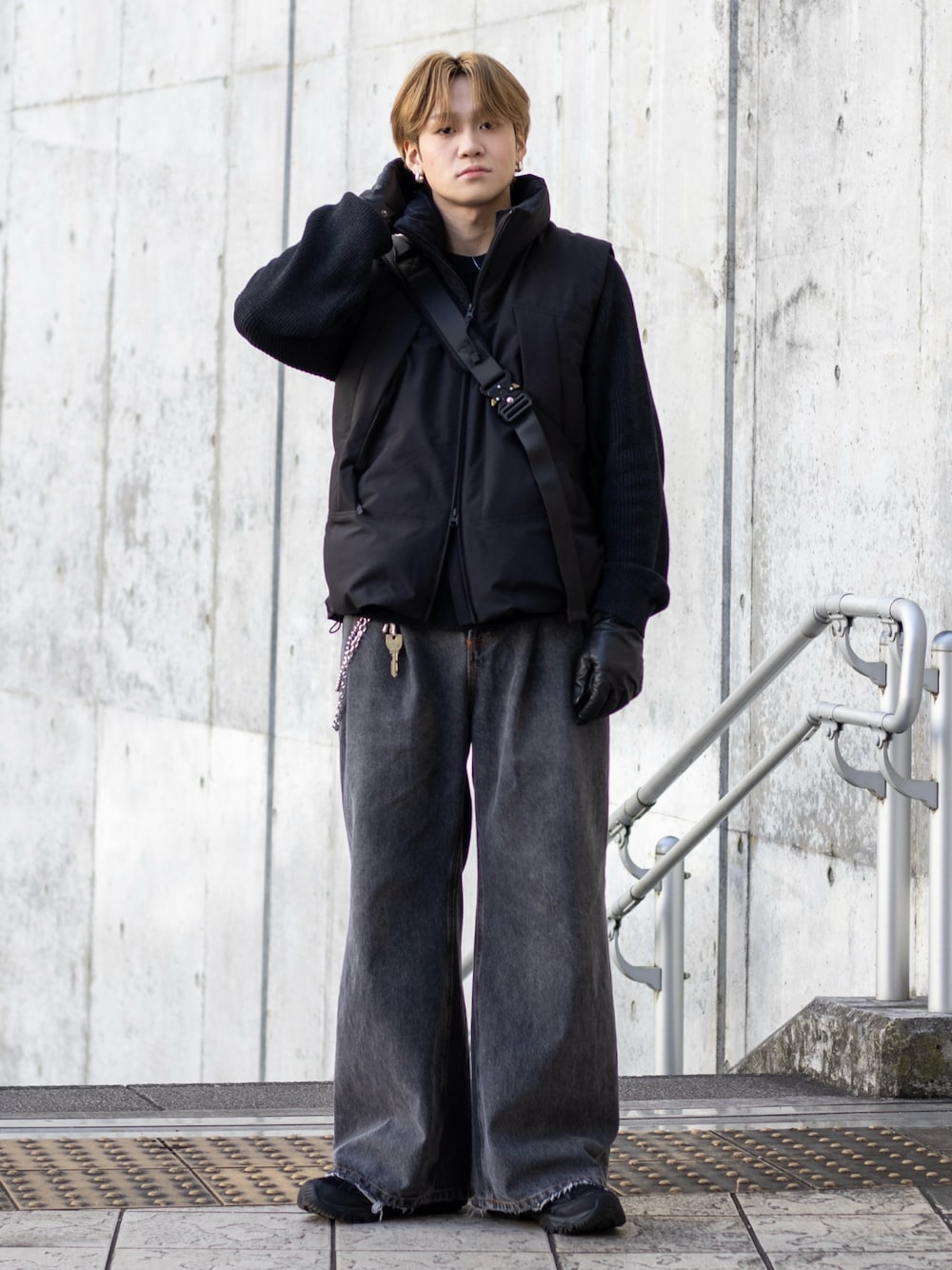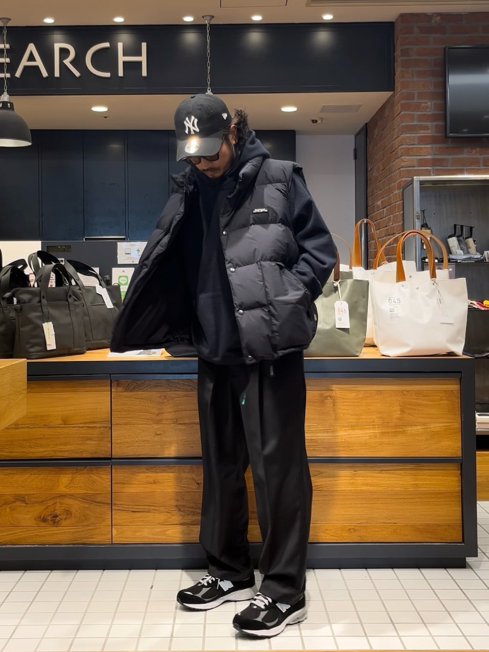 黒のダウンベストにグレーのワイドパンツを合わせた都会的なストリートコーデ。 重厚感のあるダウンベストとルーズなパンツの組み合わせが、今の気分にぴったりのリラックスしたシルエットを形成。全体をモノトーンで統一することで、カジュアルなアイテム使いながらも大人っぽく洗練された雰囲気に仕上げています。