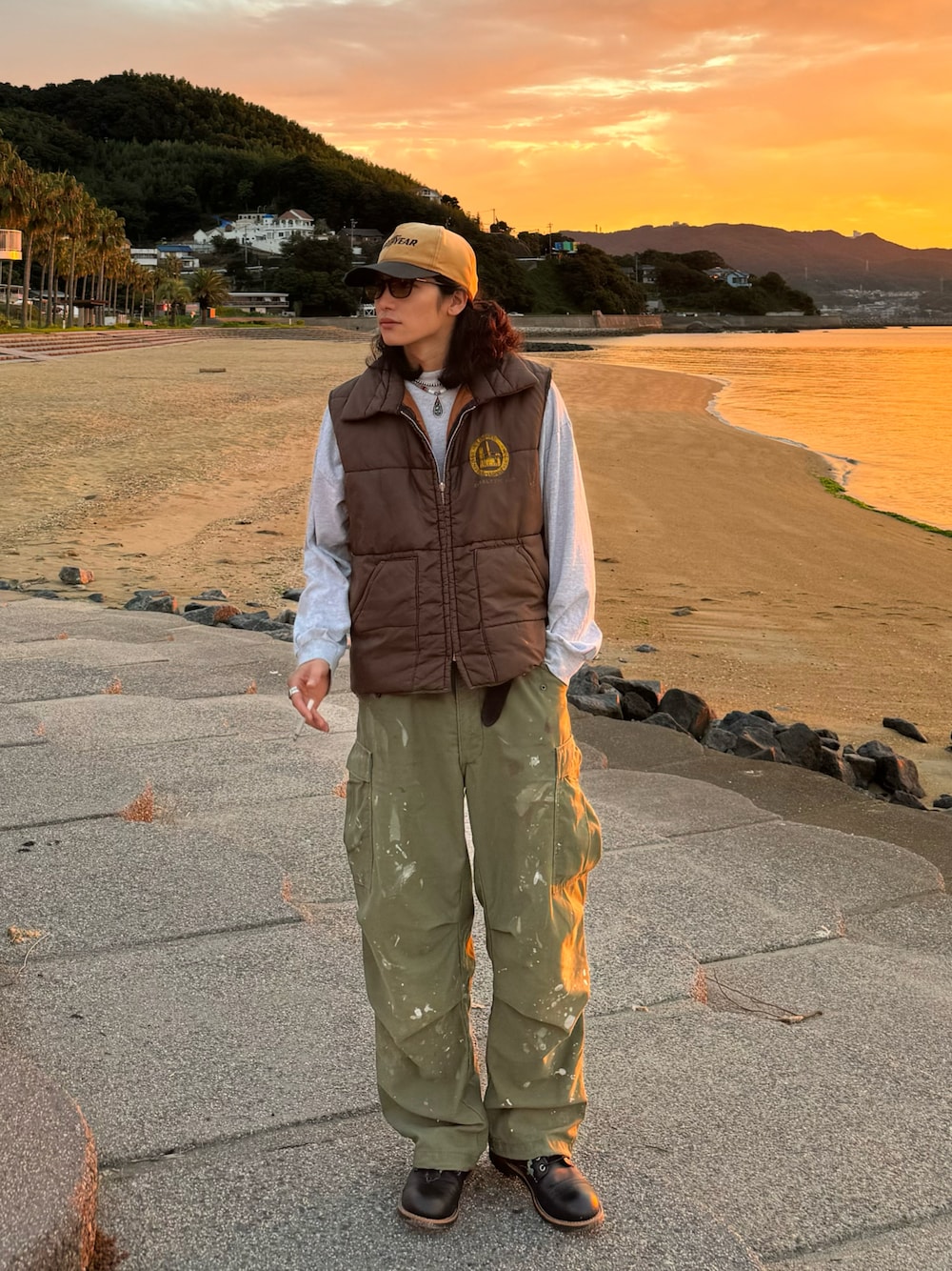 ブラウンのダウンベストにグレーのカットソー、存在感のあるカーゴパンツを合わせた無骨なワークスタイル。 全体を落ち着いたアースカラーで統一し、オーバーサイズなシルエットでこなれたストリート感を演出。 パンツのペイント加工が、シンプルなレイヤードに絶妙なアクセントを添えています。