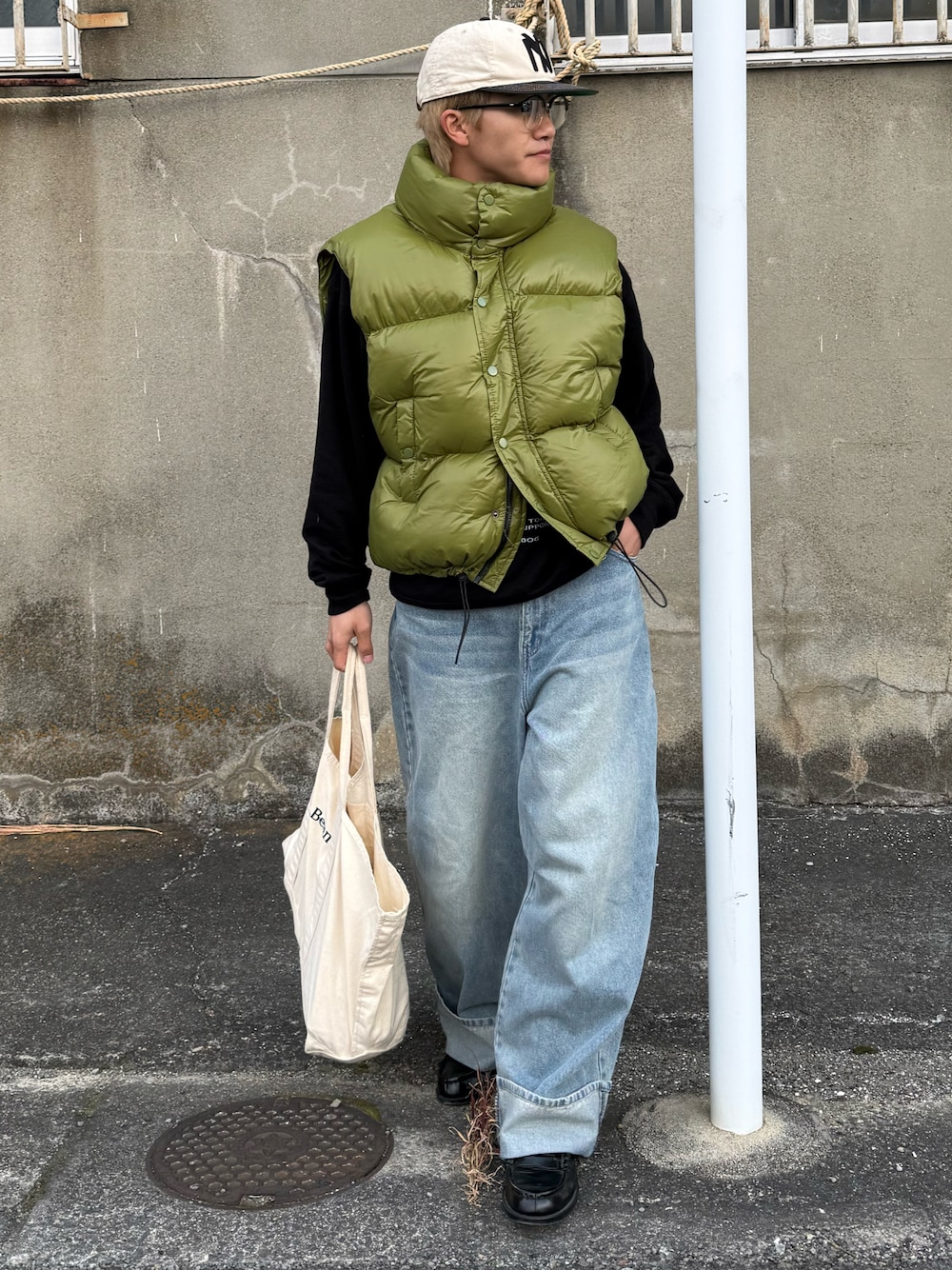 オリーブカラーのボリューム感あるダウンベストに、ワイドシルエットのデニムを合わせたストリートカジュアル。首元までしっかりとボリュームのあるベストを選ぶことで、重心が上がりスタイルアップ効果が期待できます。全体的にルーズなサイズ感でまとめつつ、足元の黒の革靴でコーディネートを程よく引き締めているのがポイントです。
