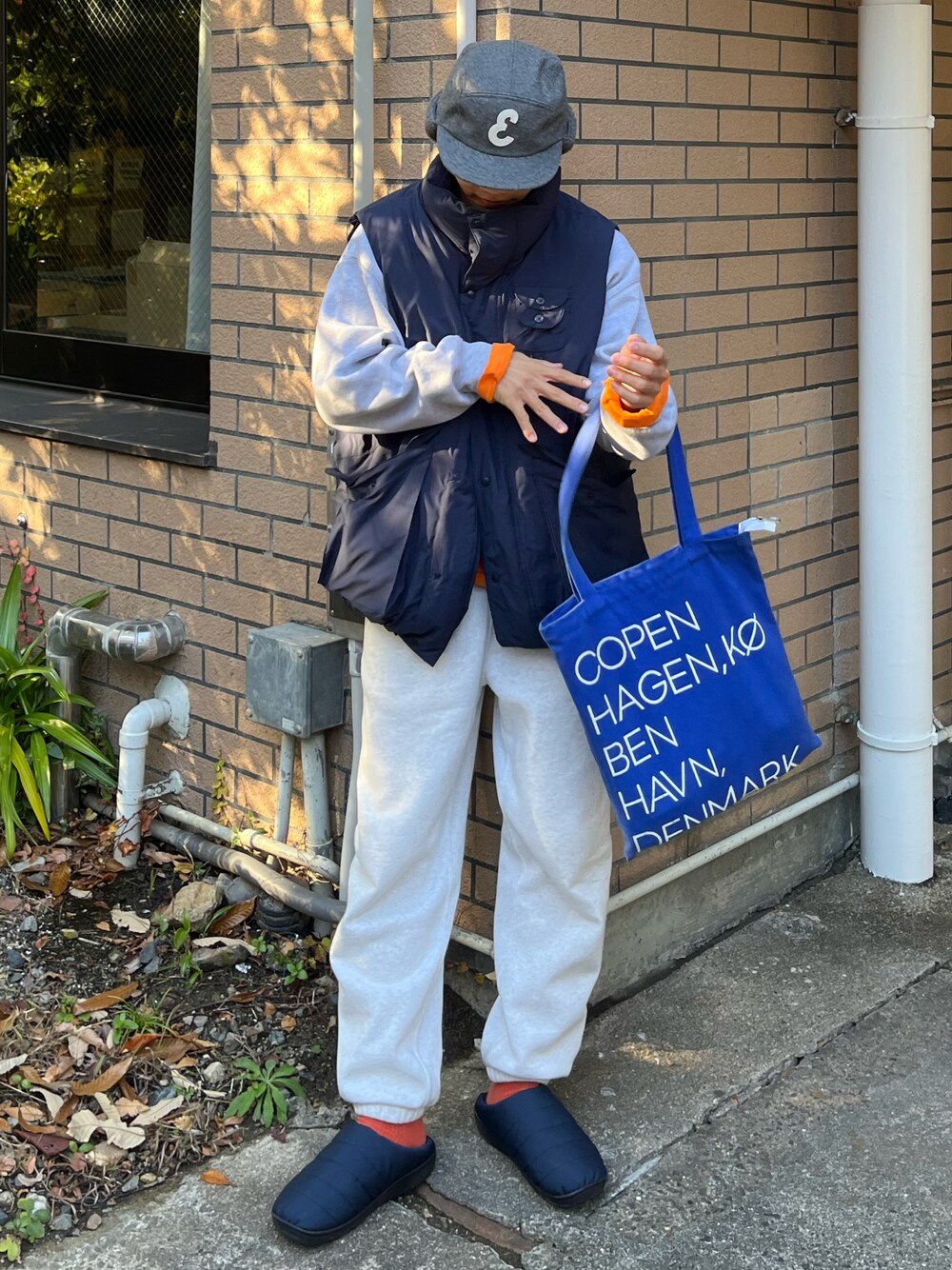 ネイビーのダウンベストに白のスウェットセットアップを合わせた、清涼感のあるストリートコーデ。上下スウェットのラフな着こなしにボリュームのあるベストを重ねることで、部屋着感を抑えたこなれ感のあるシルエットに仕上がっています。袖口や足元からチラリと覗かせたオレンジの差し色が、遊び心を感じさせる20代らしいアクティブなアクセントです。
