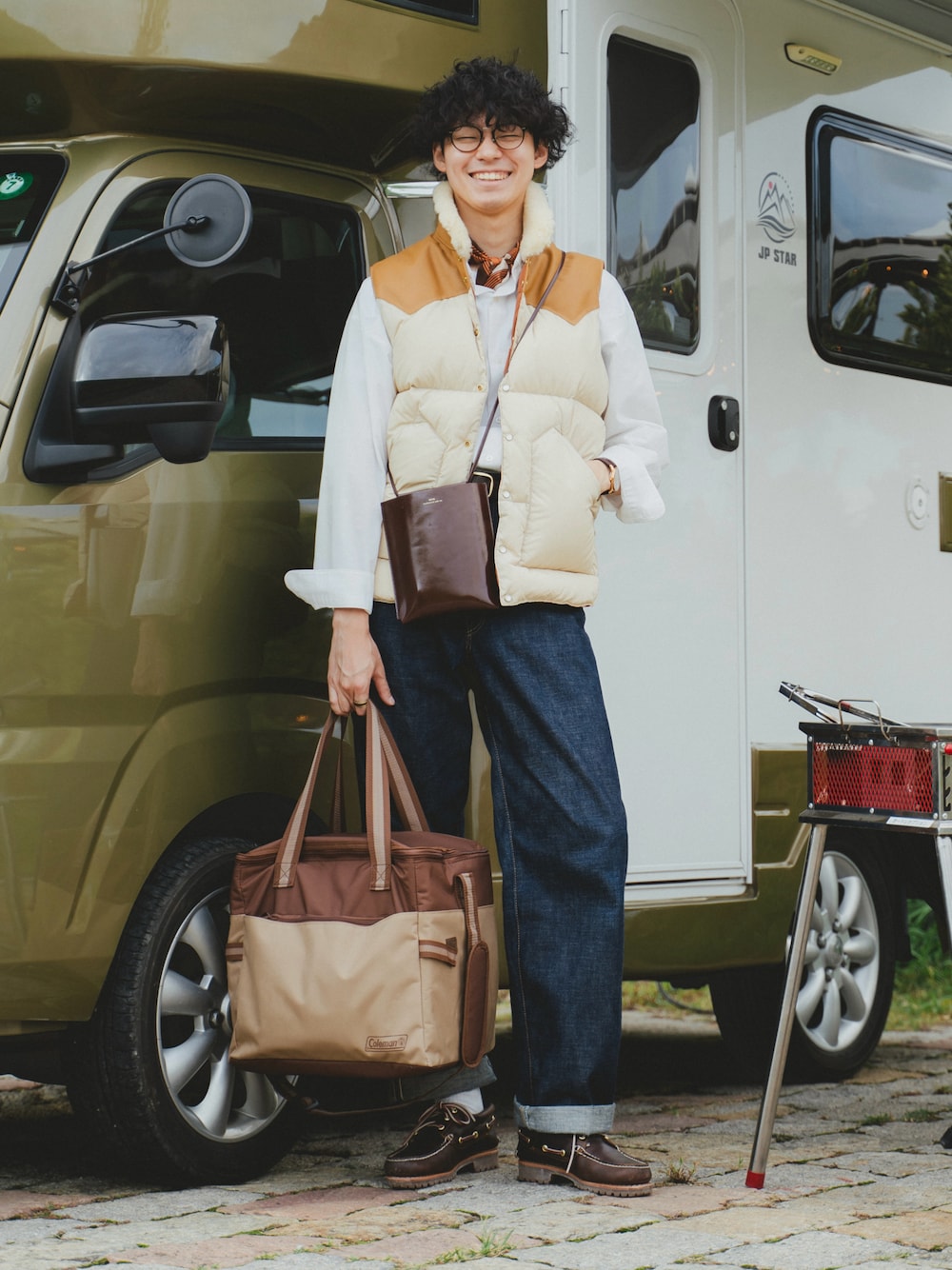 ベージュやブラウンのダウンベストに、シャツとデニムを合わせたナチュラル感のあるコーデ。中間色を主役にすることで、アウトドアライクな無骨さと都会的な柔らかさを絶妙なバランスで両立。 キャップやシューズなどの小物まで同系色でまとめて、統一感のある着こなしに仕上げています。