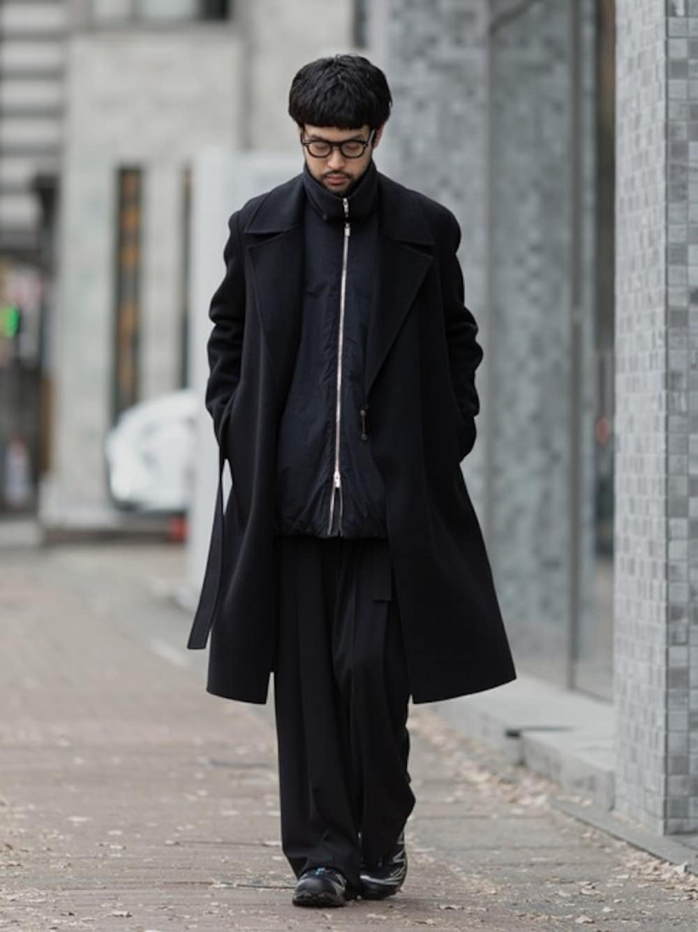 ロング丈のウールコートのインナーに、ジップアップのダウンベストを忍ばせた都会的な冬のレイヤードスタイル。全体を黒のワントーンで統一しつつ、ナイロンとウールの異素材を組み合わせることで、奥行きのある洗練された表情を演出しています。