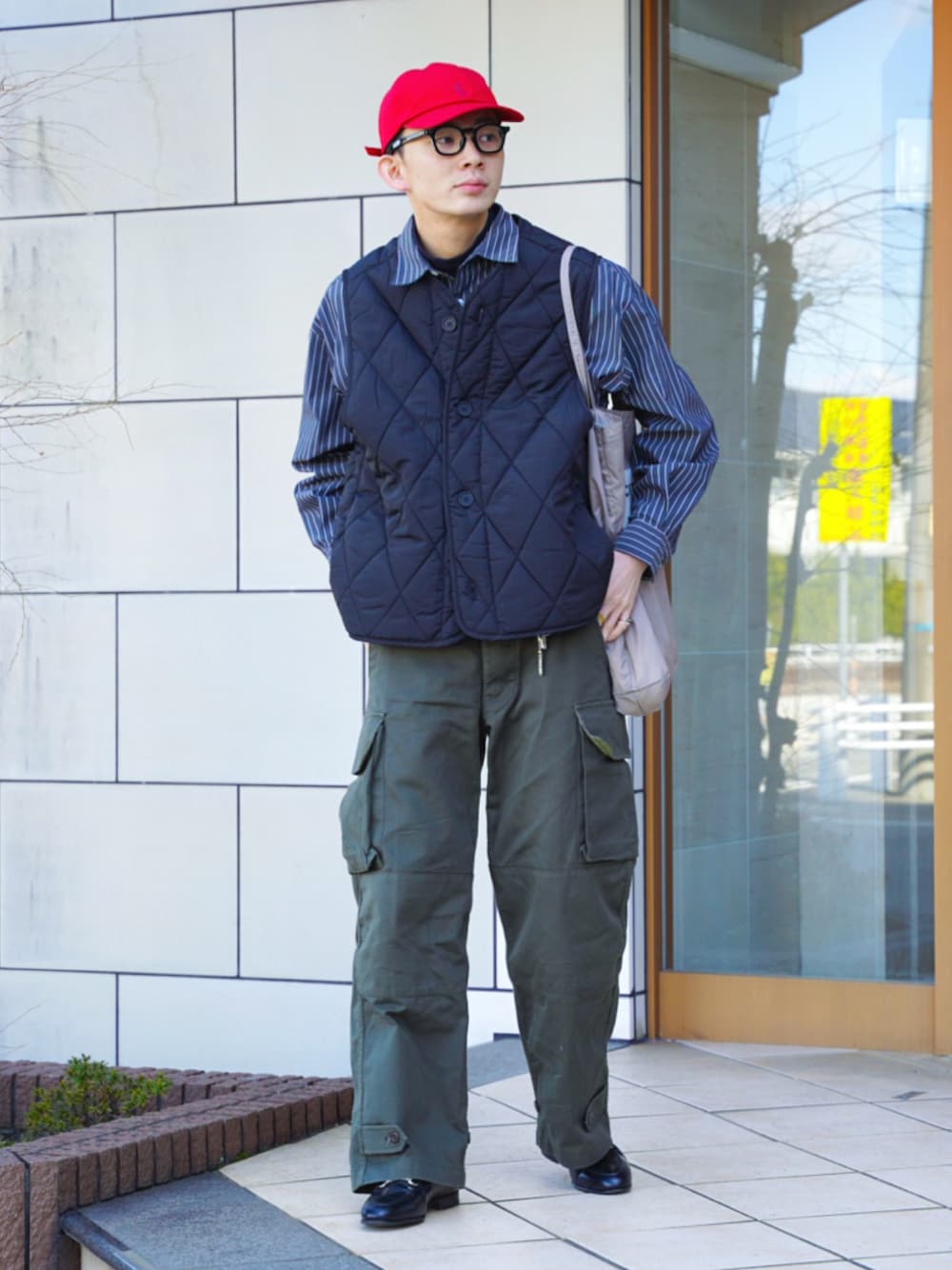 ネイビーのダウンベストに淡いブルーのシャツ、ワイドなチノパンツを合わせたシティボーイ風コーデ。 シャツの裾を出しベストのボタンをラフに留めることで、動きのあるレイヤードを演出。 落ち着いたトーンのキャップや眼鏡などの小物使いが、こなれ感をぐっと引き立てています。
