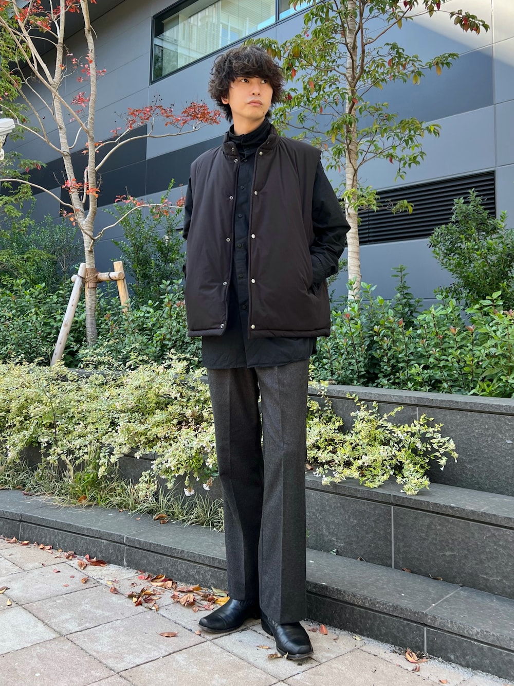 黒のダウンベストに同色のシャツ、センタープレスの効いたスラックスを合わせたきれいめコーデ。 カジュアルなベストをドレスライクなアイテムとミックスさせることで、洗練された都会的な雰囲気を演出。 全体を落ち着いたトーンでまとめつつ、足元のレザーシューズで品よく引き締めています。