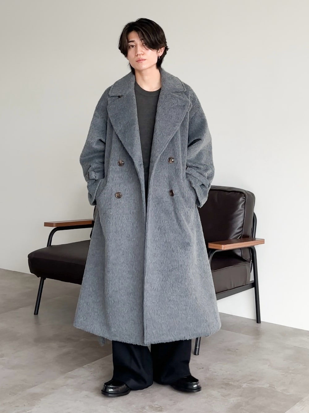 グレーのシャギーコートに、ダークトーンのインナーと黒のワイドスラックスを合わせた冬コーデ。 全体をモノトーンのグラデーションでまとめることで、都会的で洗練された印象に。 重厚感のあるロングコートをさらりと羽織るバランスが、大学生のお手本にもおすすめのスタイルです。